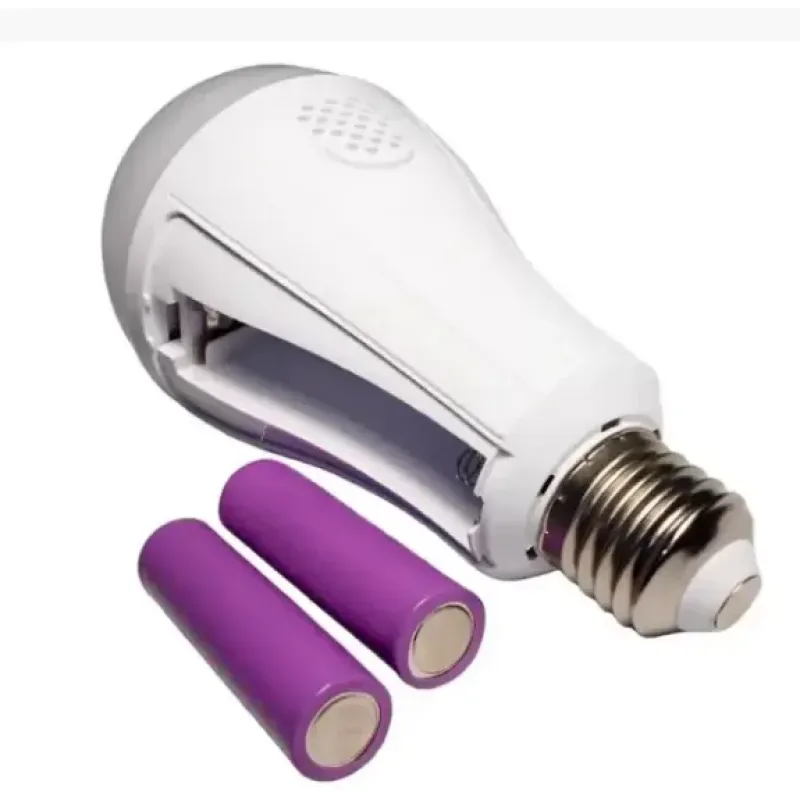 Встановіть два акумулятори 18650 у лампу, вкрутіть її у патрон Е27. При наявності електрики лампа працює від мережі та заряджає акумулятори. При відключенні світла автоматично перемикається на акумуляторну роботу. Для тривалого використання майте запасний комплект заряджених батарей.