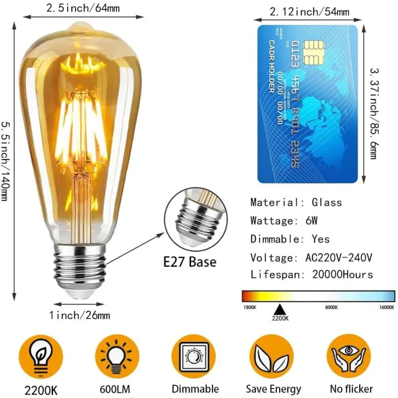 Ці LED-лампи споживають лише 6W замість 60W звичайних ламп, забезпечуючи таку ж яскравість. Термін служби до 25 000 годин означає, що ви забудете про заміну ламп на роки. Теплий відтінок 2200K створює м'яке золотисте світло, ідентичне класичним лампам Едісона.