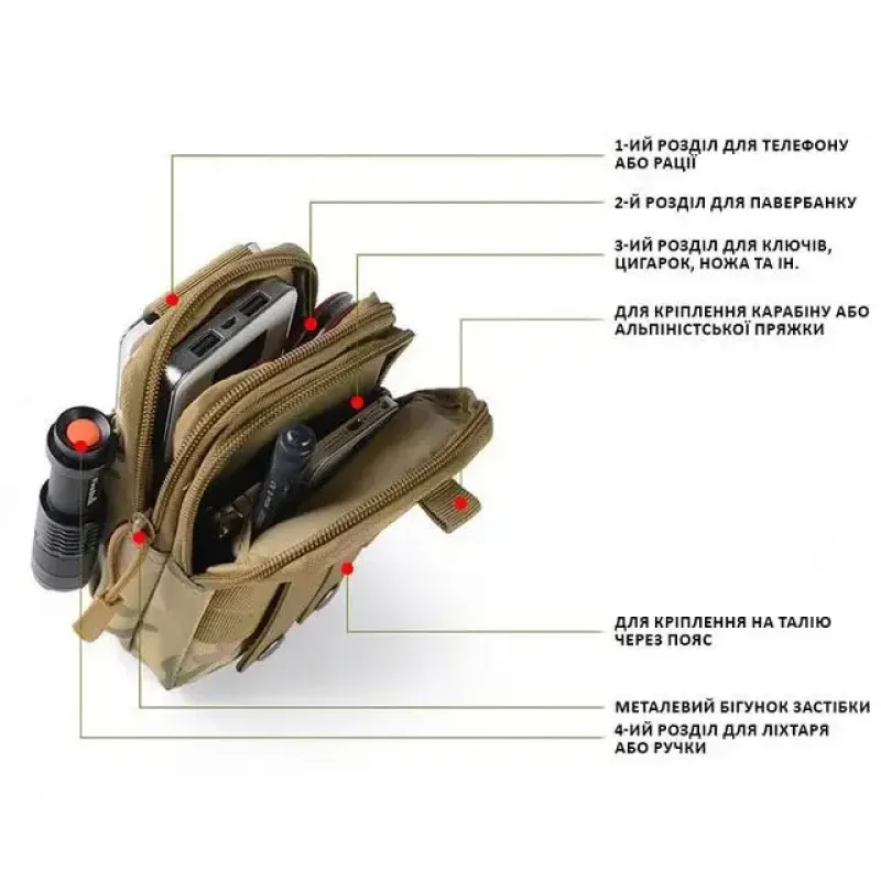 Теги: тактичні сумки, MOLLE, органайзери, телефонні чохли, кордура, тактичне спорядження