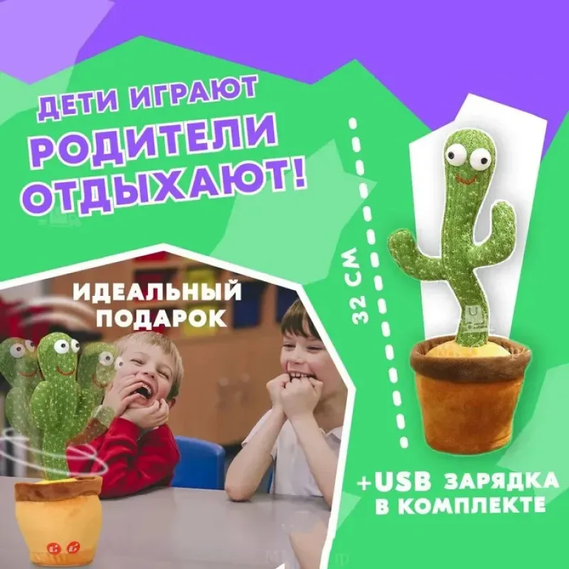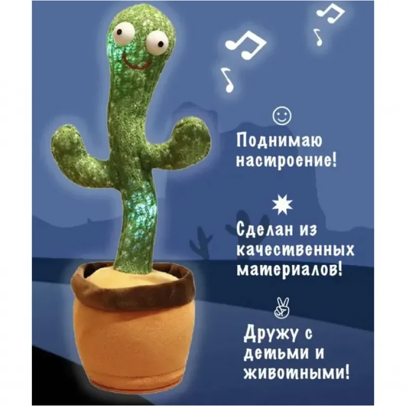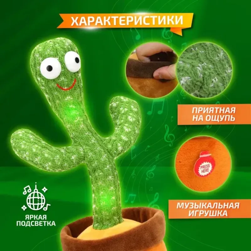 Плюшевый танцующий кактус – это лучший подарок, который надолго увлечет как детей, так и взрослых, и подарит массу радостных эмоций.