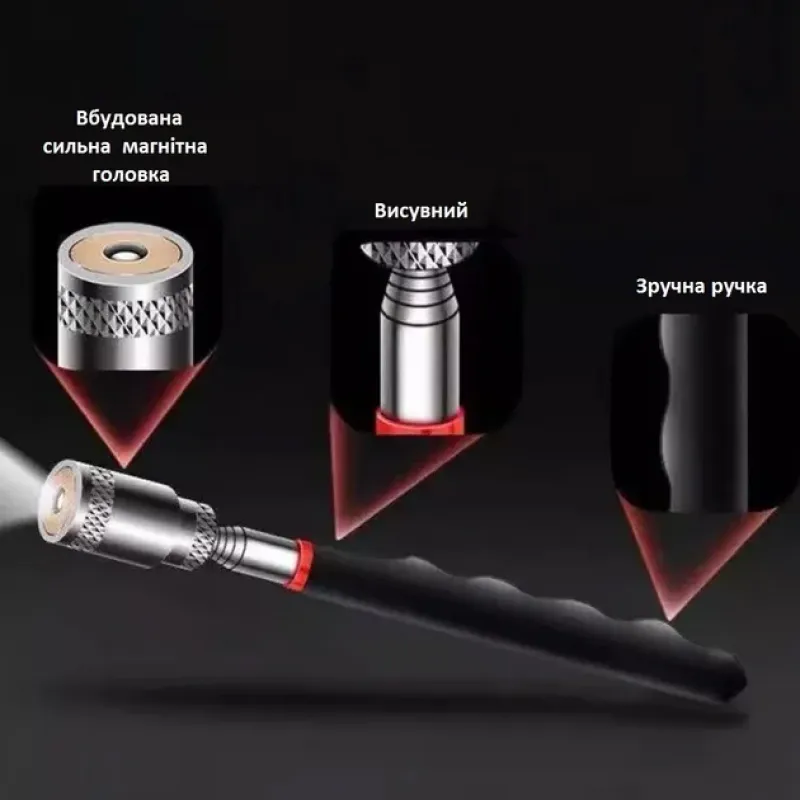 Магнитный наконечник, расположенный на крыльчатке затопления, позволяет вытягивать предметы из-под его потужного магнитного поля. Портативный и удобный в использовании, этот инструмент может вырасти до 80 см, при этом его длина в складном виде станет выше 19 см. Качественный телескопический манипулятор с магнитной головкой и подсветкой. Позволит достать металлические предметы из труднодоступных мест.