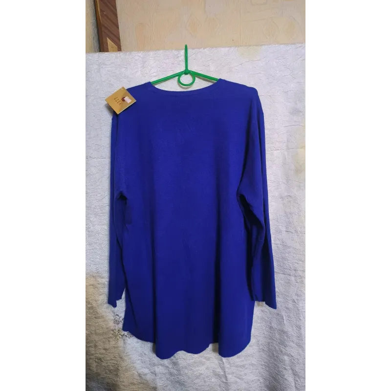 Елегантна жіноча туніка насиченого синього кольору (електрик) стане яскравим акцентом вашого гардероба. Модель прикрашена вишуканим візерунком у формі листя, викладеним із сяючих стразів, що додає образу святковості та шарму. Виріб виконаний з м'якого та приємного на дотик трикотажу, який добре тягнеться та сідає по фігурі. Подовжений крій (фасон туніки) дозволяє носити цю модель як з лосинами, так і з класичними брюками, вміло приховуючи недоліки фігури та підкреслюючи її переваги. Ідеальний варіант як для святкових подій, так і для повсякденного використання в прохолодну пору року. Характеристики: Тип виробу: Туніка / Подовжений светр Сезон: Осінь / Зима / Весна Колір: Синій (Електрик) Декор: Стрази (каміння) у вигляді листя Матеріал: Трикотаж (м'яка в'язка) Рукав: Довгий