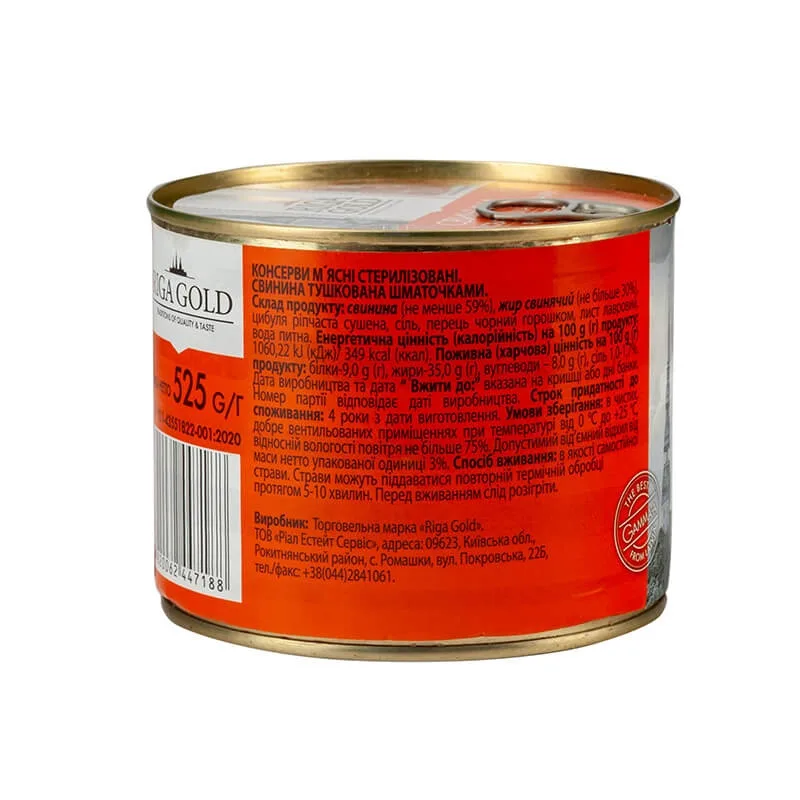 🛒 Шукаєте надійний товар? Ви можете купити Тушонка свиняча Riga Gold шматочками, свинина тушкована Рига Голд, м'ясні консерви преміум в нашому інтернет-магазині Shtyrman. Гарантія якості та швидка доставка по всій Україні!