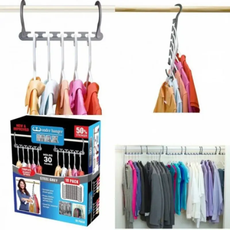 Wonder Hanger Max – это очень удобная складная вешалка, позволяющая сэкономить массу свободного места. Универсальную вешалку можно расположить в платяном шкафу двумя способами: в горизонтальном положении на двух крючках и в вертикальном на одном крючке. Перекладины можно двигать, легко снимая необходимую вещь. Такая вешалка позволяет разместить пять пар брюк, несколько топов или других предметов гардероба одновременно.