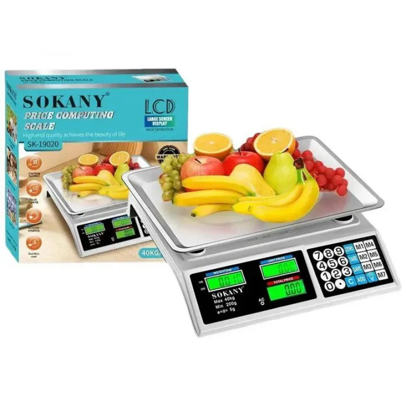 Ваги торгові Sokany SK-19020 40 кг — точне зважування для кулінарних рецептів та дієтичного контролю. Точність вимірювання до 1-5 грамів забезпечує ідеальний результат у кулінарії та кондитерстві. Зрозумілий цифровий дисплей відображає вагу у різних одиницях: кг, фунти, унції. Функція тара дозволяє зважувати продукти в посудині. Автоматичне вимкнення економить заряд батарейок.