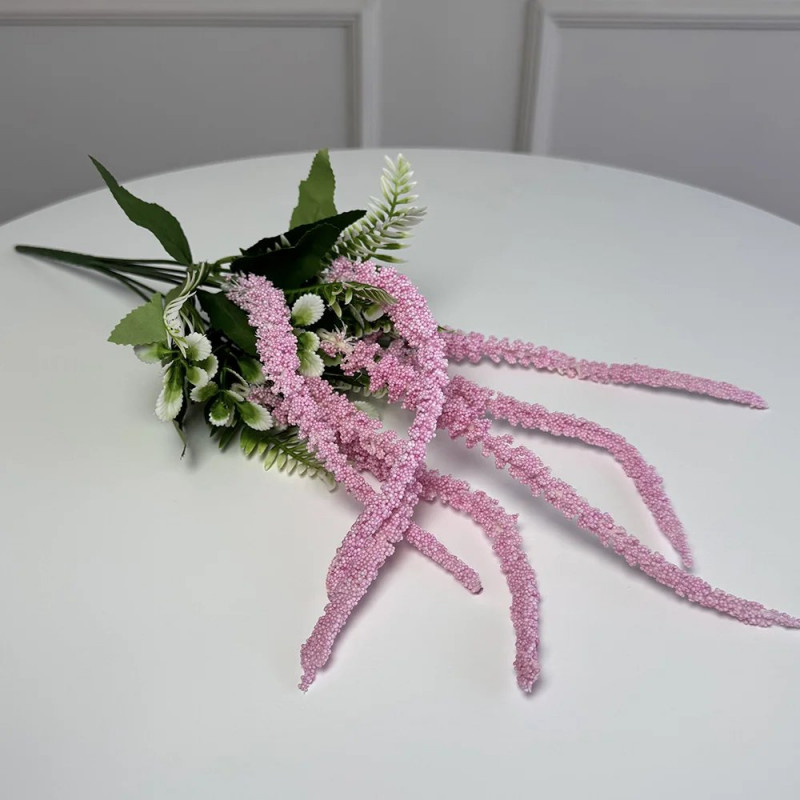 Искусственная ветвь амаранта розового цвета отличается изящными поникающими соцветиями и нежной текстурой, что создает эффект легкой динамики в композиции. Мелкие декоративные элементы равномерно расположены по всей длине ветки, придавая ей естественный вид и мягкий объем. Розовый оттенок придает интерьеру тепла, романтичность и визуальную легкость.
