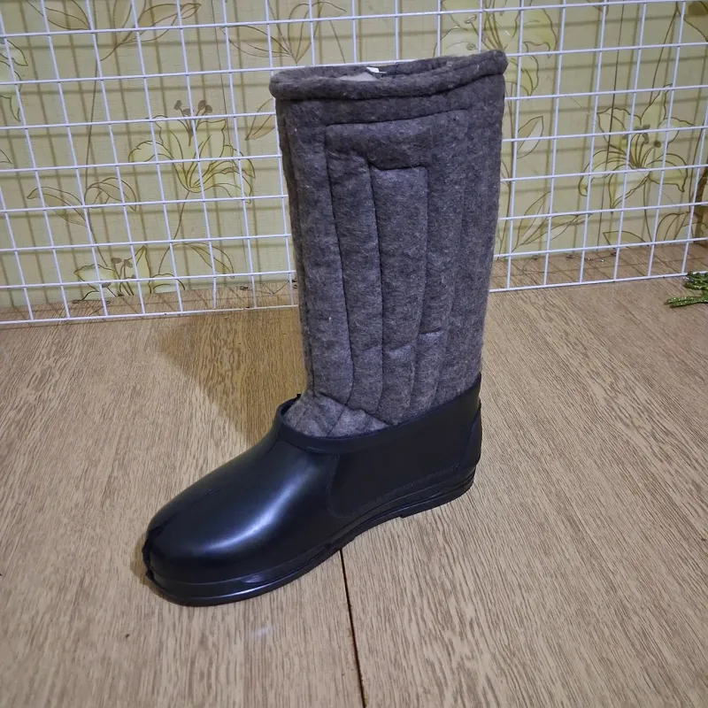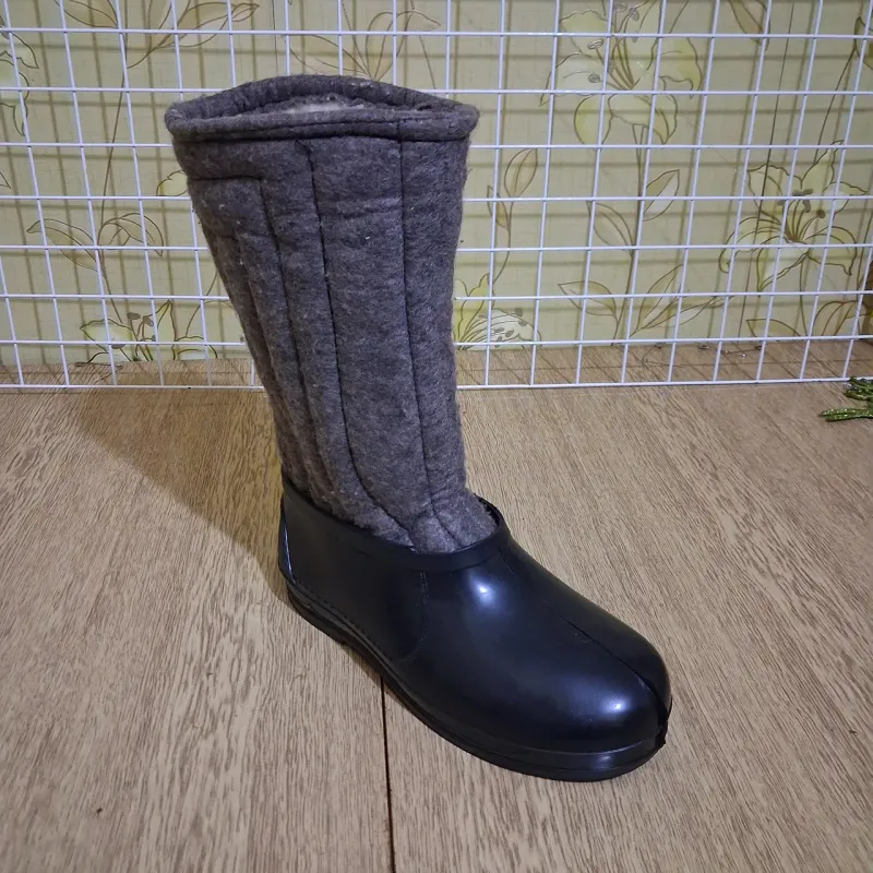 Класичні високі валянки. Низ — суцільнолита водонепроникна калоша (ПВХ). Верх — тепле стьобане сукно (повсть). Без застібок. Дуже теплі. Виробництво Україна. Повний опис: Ці високі зимові бурки — це перевірена часом класика, яка рятує в найлютіші морози. Модель поєднує в собі тепло традиційного валянка та практичність гумових чобіт. Низ взуття ("калоша") виготовлений з морозостійкого ПВХ, який не тріскається на холоді та на 100% захищає від води та сльоти. Халява висока, пошита з багатошарового утепленого сукна (повсті) зі стьобаною фактурою, що створює повітряну подушку для збереження тепла. Чому це взуття — лідер продажів для зими: Максимальне тепло: Висока халява гріє не тільки стопу, а й гомілку. Захист від снігу: У таких чоботях можна сміливо йти по кучугурах — сніг не потрапить всередину. Універсальність: Розмірна сітка 38-45 дозволяє взути і бабусю, і дідуся, і підлітка. Простота: Ніяких блискавок чи шнурків, які можуть зламатися. Просто взув і пішов. Характеристики: Виробник: Україна Тип: Бурки високі / Валянки / Бабуші Матеріал низу: ПВХ (гума) Матеріал верху: Стьобана повсть (сукно) Застібка: Без застібки (Pull-on) Колір: Чорний низ / Сірий верх Сезон: Зима Розміри: 38, 39, 40, 41, 42, 43, 44, 45