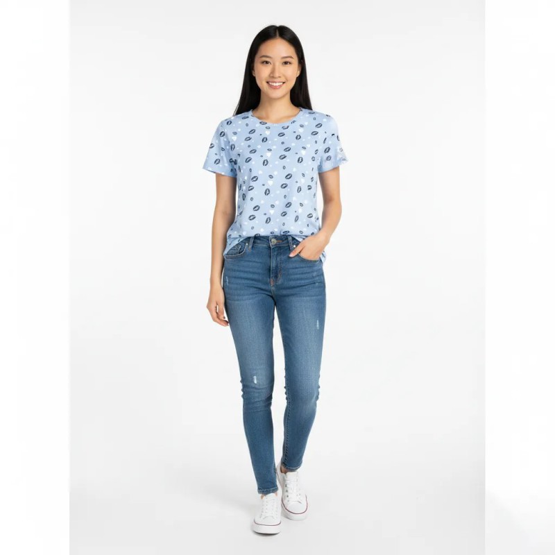 Ця футболка поєднує ніжний блакитний колір з грайливим принтом, створюючи універсальну річ для будь-якого casual образу. Якісна тканина зберігає форму, а дизайн додає романтичності вашому стилю.