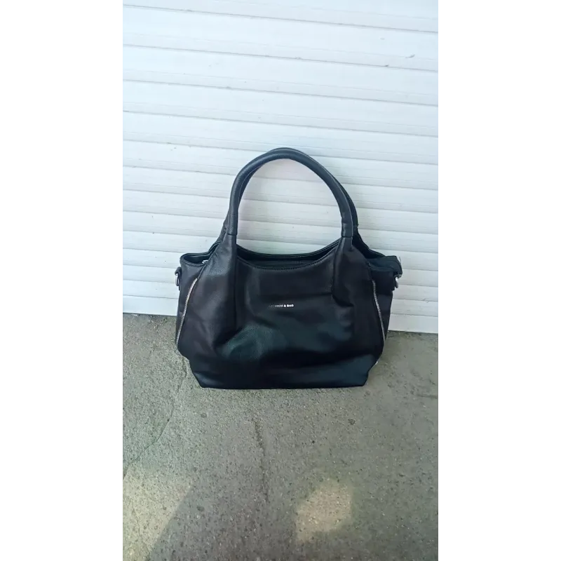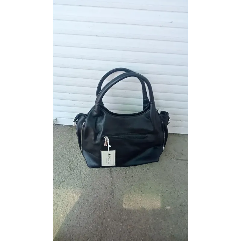 Ця чорна жіноча сумка — ідеальний вибір для тих, хто шукає універсальний аксесуар на кожен день. Класичний чорний колір та лаконічний дизайн дозволяють поєднувати її з будь-яким стилем одягу. Виготовлена з якісної, приємної на дотик еко-шкіри, яка має м'яку фактуру, але при цьому надійна в експлуатації. Особливістю моделі є декоративні металеві блискавки з боків, які додають сумці стильного акценту. Зручні ручки середньої довжини дозволяють комфортно носити сумку як у руці, так і на плечі, навіть на верхній одяг. Сумка дуже містка: в неї легко помістяться документи формату А5, планшет, косметичка, парасолька та інші необхідні речі. На тильній стороні передбачена кишеня на блискавці для швидкого доступу до ключів або телефону. Характеристики: Матеріал: Еко-шкіра (м'яка, текстурна) Колір: Чорний (Black) Тип сумки: Хобо / Тоут Розмір: Середній / Великий Застібка: Блискавка зверху Декор: Сріблясті блискавки з боків, логотип Сезон: Всесезонна