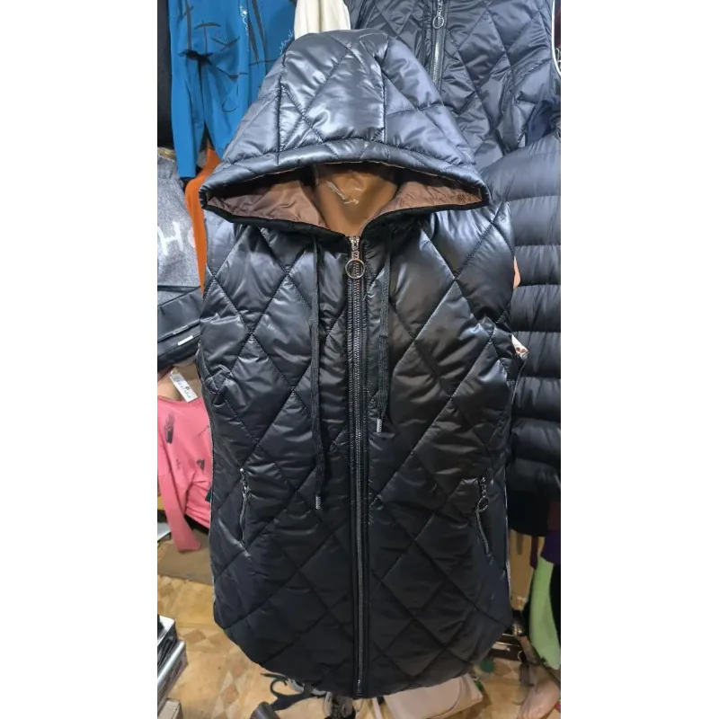 Відкрийте для себе унікальну жіночу теплу жилетку з капюшоном Чорна (ромб). Ця стьобана безрукавка зі стразами ідеально підходить для жінок, які хочуть бути стильними та тепло одягнутими під час холодної пори року. Розмір 46-54.