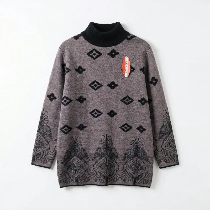 Стильна та тепла жіноча туніка з ангори у вишуканому сіро-ліловому кольорі (темна пудра) — справжня знахідка для зимового гардероба. Модель поєднує в собі елегантність та комфорт: подовжений фасон ідеально підходить для носіння з лосинами або вузькими брюками, візуально витягуючи силует та приховуючи недоліки. Виріб прикрашений контрастним чорним орнаментом у вигляді ромбів та витонченого візерунка "пір'я" по низу. Особливий шарм додає чорний пухнастий комір-стійка та оздоблення манжетів, що робить образ завершеним. М'яка, приємна на дотик тканина з додаванням ангори чудово зігріває, не колеться і дарує відчуття затишку. Характеристики: Розміри в наявності: 52, 54, 56 (Батал). Колір: Сіро-ліловий (Тауп/Темна пудра) з чорним. Матеріал: Ангора, вовна, акрил. Фасон: Подовжений (туніка), А-силует. Декор: Геометричний принт, пухнастий ворс на комірі. Сезон: Зима, Холодна осінь.