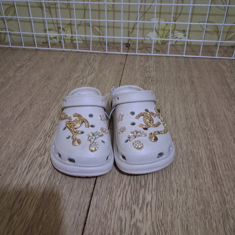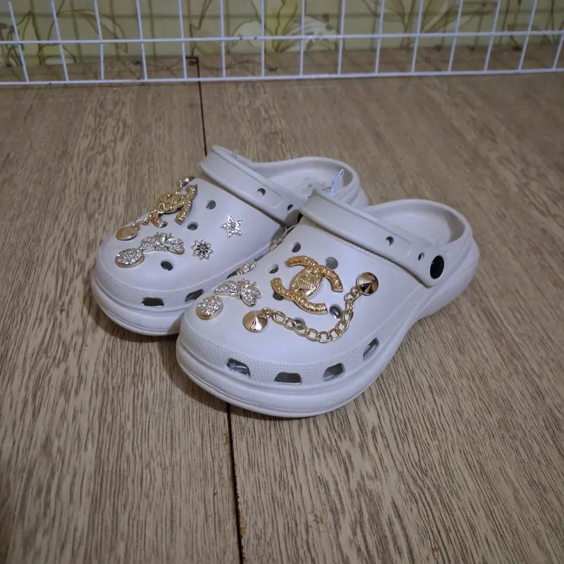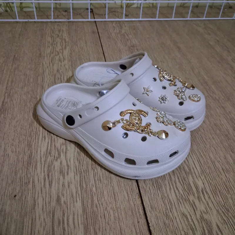 Платформа додає не лише висоти, але й додаткової амортизації, що робить ходьбу легкою та приємною навіть після тривалого носіння. Ергономічна конструкція підошви забезпечує правильний розподіл навантаження на стопу, що особливо важливо для тих, хто проводить багато часу на ногах. У комплекті йдуть стильні джибітси — ланцюжки та логотип, які дозволяють персоналізувати ваше взуття та створити унікальний образ. Ви можете змінювати декор залежно від настрою та випадку, роблячи кожен день особливим.