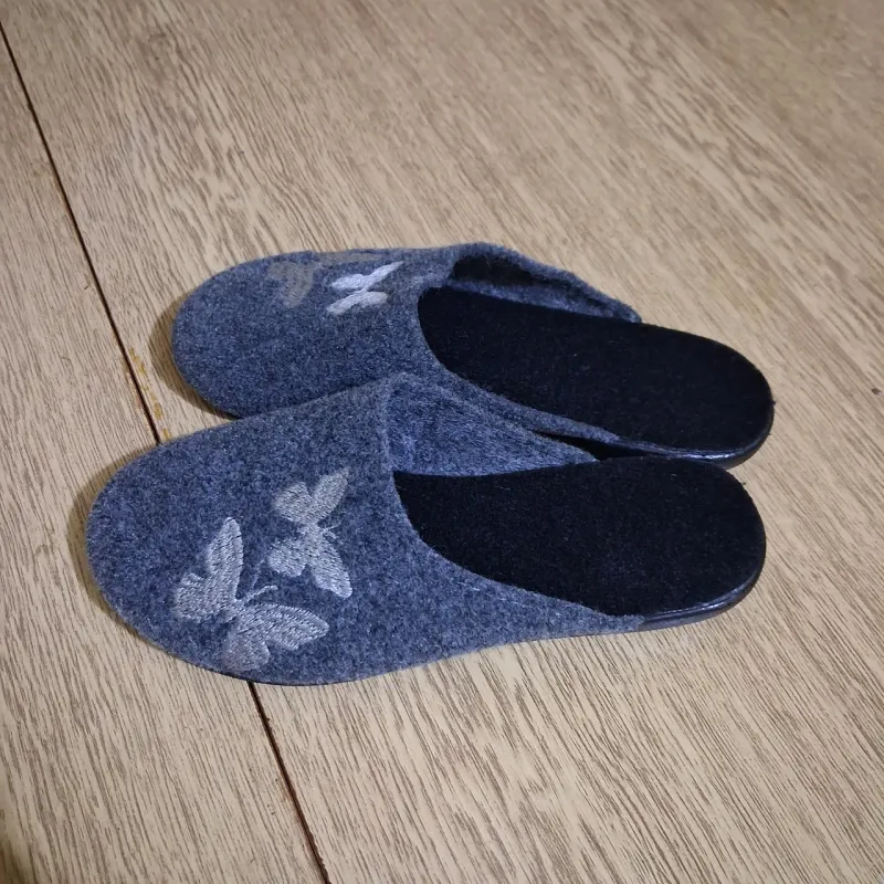 Затишні жіночі капці з повсті. Ніжна вишивка (метелики). Анатомічна підошва Klerotex. М'які, теплі, не парять ногу. Розміри 36-41. Повний опис: Створіть атмосферу затишку з цими чудовими жіночими тапочками Klerotex. Модель виконана у спокійному сірому кольорі та прикрашена витонченою сріблястою вишивкою у вигляді двох метеликів, що додає їм легкості та жіночності. Верх та устілка виготовлені з натуральної повсті (фетру). Це унікальний матеріал, який створює ефект "сухого тепла": взимку в них не холодно, а влітку нога не пітніє. Чому ви полюбите ці тапочки: Дизайн: Акуратна вишивка робить їх чудовим подарунком для мами, сестри чи подруги. Підошва Klerotex: Спеціальна хвиляста текстура підошви запобігає ковзанню на плитці та ламінаті. Легкість: Вони майже невагомі на нозі. Практичність: Чорна устілка не мажеться, а сірий верх довго зберігає охайний вигляд. Характеристики: Виробник: Klerotex (Україна) Тип: Кімнатні тапочки Матеріал верху: Повсть (фетр) Матеріал підошви: ПВХ (Klerotex) Колір: Сірий Декор: Вишивка "Метелики" Розміри: 36, 37, 38, 39, 40, 41 🗝 Ключові слова (теги):