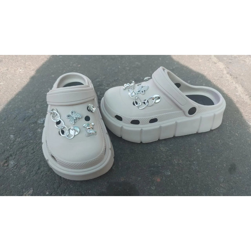 Додайте блиску своєму літньому образу з цією неймовірною парою кроксів на платформі! Ця модель — ідеальне поєднання комфорту класичних сабо та найгарячіших модних трендів. Висока підошва візуально подовжує ноги, не обтяжуючи їх, адже взуття виготовлене з легкого матеріалу EVA. Головна "фішка" моделі — ексклюзивний декор: Верх взуття прикрашений стильними сріблястими ланцюжками, що додають образу гранжу та зухвалості. Композицію доповнюють блискучі джибітси у формі метеликів, ведмедиків та камінців, які переливаються на сонці. Ніжний бежевий (молочний) колір є універсальним і пасує під будь-який літній одяг: від джинсових шортів до легких суконь. Зручний п'ятковий ремінець дозволяє носити їх як шльопанці або фіксувати на нозі як сандалі. Ідеальний вибір для прогулянок містом, пляжу або яскравих фотосесій. Характеристики: Розміри: 37, 38, 39, 40, 41 Колір: Бежевий / Молочний Матеріал: Піна (EVA) — легкі та водостійкі Підошва: Висока платформа Декор: Знімні прикраси (ланцюги, фігурки, стрази) сріблястого кольору Сезон: Літо