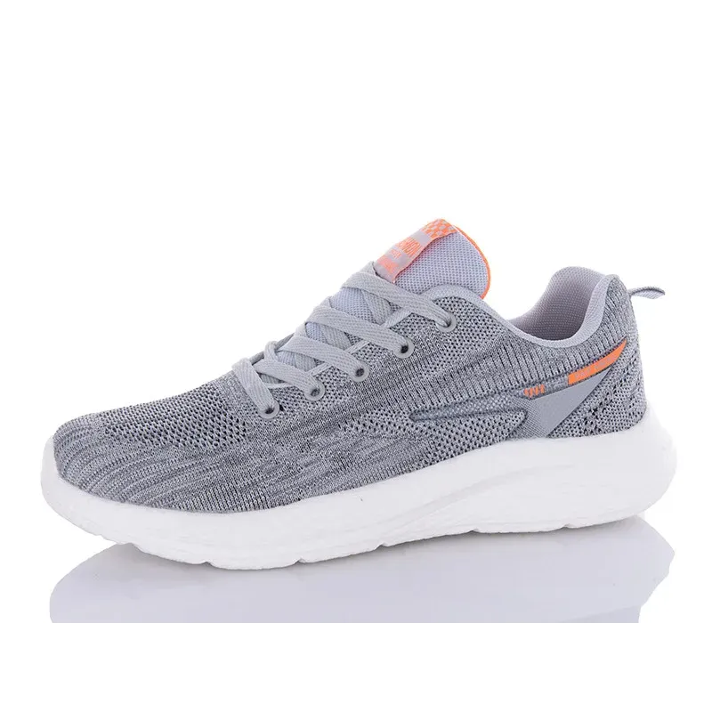 Шукаєте найзручніше взуття на літо? Ці жіночі текстильні кросівки — саме те, що потрібно для активного життя. Верх моделі виготовлений за технологією безшовного плетіння (в'язаний текстиль), завдяки чому вони сідають по нозі як шкарпетки, ніде не тиснуть і забезпечують максимальну вентиляцію. Універсальний сірий колір стильно доповнений яскравими помаранчевими вставками на язичку та збоку, що додає образу свіжості. Біла підошва з піни дуже легка та пружна, вона відмінно амортизує кроки, знімаючи втому з ніг. Це ідеальний вибір для довгих прогулянок, занять у спортзалі або просто як комфортне взуття на кожен день. Характеристики: Матеріал верху: Текстиль (В'язана сітка) Матеріал підошви: Піна (ПВХ) — біла, легка Колір: Сірий (з помаранчевими елементами) Застібка: Шнурівка Сезон: Літо / Весна / Суха осінь Розмірна сітка: 37-41