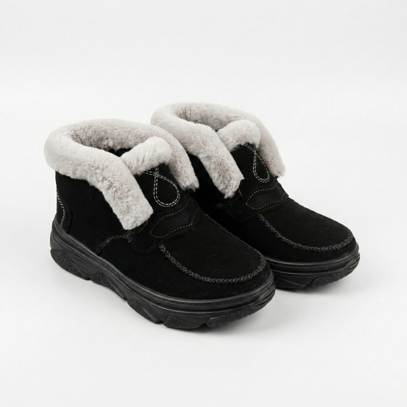 Ми створили взуття, яке дійсно гріє. Натуральне біле хутро всередині створює повітряну прошарку, що зберігає тепло навіть при -25°C. Еко-замша високої якості не пропускає вологу та вітер, а чорний колір універсальний для будь-якого гардеробу. Коротка модель зручна для повсякденного носіння — легко одягати та знімати, при цьому гомілка надійно захищена від холоду.