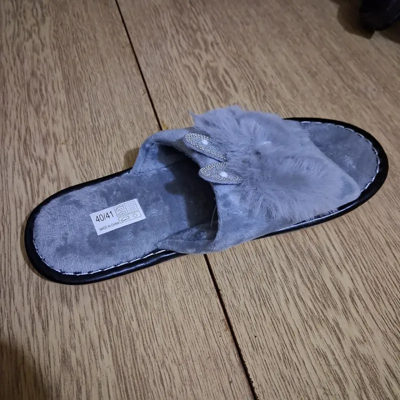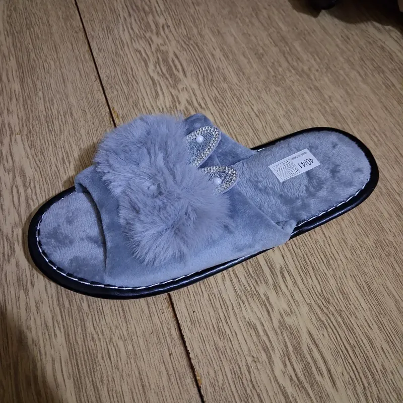Подаруйте своїм ніжкам справжній комфорт та затишок з цими чудовими пухнастими тапочками! Ця модель поєднує в собі м'якість штучного хутра та вишуканий дизайн. Головна "родзинка" пари — декоративні елементи у вигляді вушок, щедро прикрашені блискучими стразами, що додають вашому домашньому образу нотку гламуру та грайливості. Тапочки виконані з високоякісних матеріалів, які приємні на дотик і чудово зберігають тепло. Відкритий носок дозволяє шкірі дихати, тому в них буде комфортно не тільки взимку, але й у прохолодні весняні або осінні дні. Підошва надійно прошита, що гарантує довговічність виробу, а універсальний сірий колір пасуватиме до будь-якого домашнього одягу. Ці шльопанці стануть ідеальним вибором для тих, хто цінує зручність та красу в деталях. Вони також стануть чудовим подарунком для близької людини, мами, сестри або подруги. Характеристики: Тип взуття: Домашні тапочки (шльопанці) Матеріал верху: Штучне хутро (текстиль) Матеріал устілки: Штучне хутро Декор: Вушка зі стразами Підошва: Прошита, нековзна Колір: Сірий Сезон: Осінь/Зима/Весна Країна виробник: Китай Розміри: 36-41