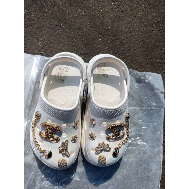 Жіночі сабо (крокси) білі з золотим декором та ланцюжком - стильний і елегантний варіант взуття для жінок. Ці сабо ідеально підходять для літньої пори року і можуть бути поєднані з різними видами одягу.