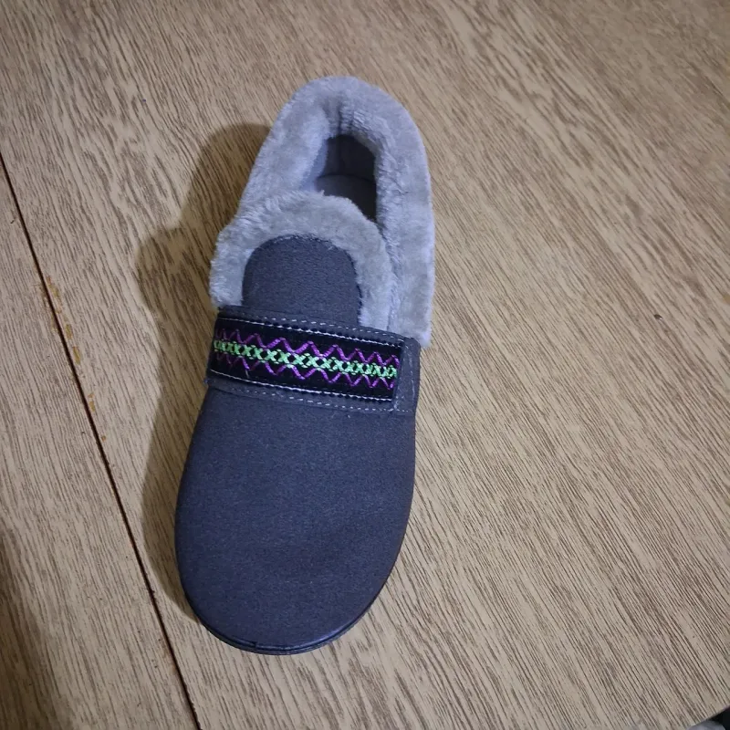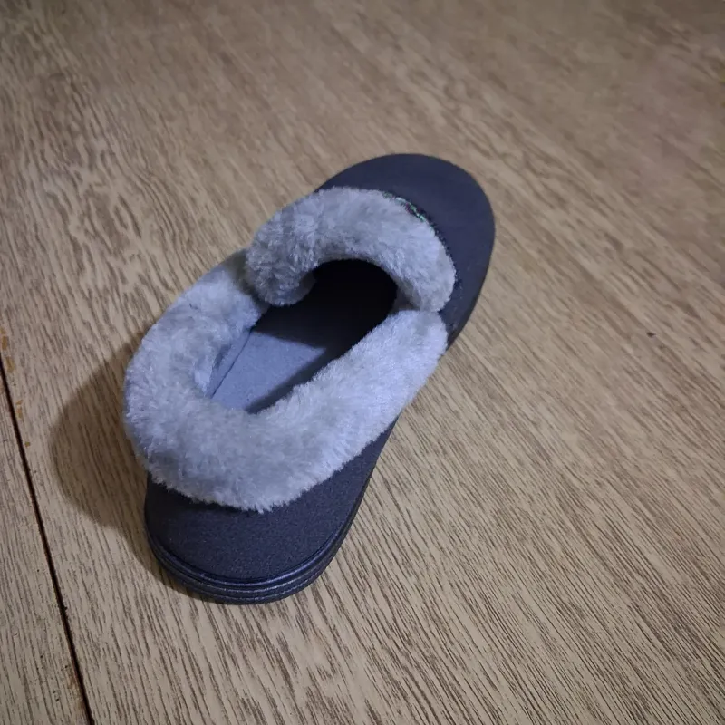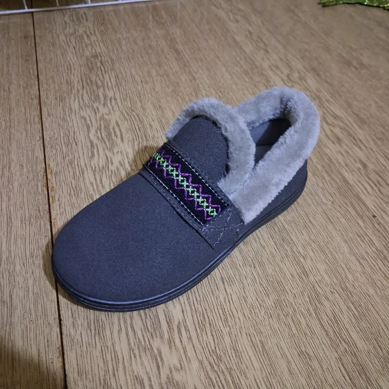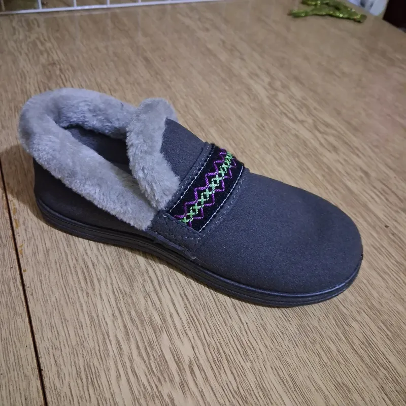 Неймовірно м'які та теплі жіночі кімнатні тапочки, які зігріють ваші ніжки у холодну пору року. Модель виконана у практичному темно-сірому кольорі з м'якого текстилю, що імітує замшу, та прикрашена стильною етнічною вишивкою. Густа хутряна облямівка світло-сірого кольору не лише додає затишку, а й надійно утримує тепло всередині. Закритий фасон типу "чуні" забезпечує максимальний комфорт та захист від протягів. Підошва виготовлена з міцного та гнучкого матеріалу (ПВХ/Гума), має рельєфний візерунок, що запобігає ковзанню по плитці, паркету чи ламінату. Тапочки легкі, не обтяжують ногу та дарують відчуття повного розслаблення після важкого робочого дня. Переваги: Тепло: Густе штучне хутро всередині забезпечує чудову терморегуляцію. Дизайн: Акуратна вишивка та пухнастий відворот виглядають дуже стильно. Зручність: М'яка устілка та гнучка підошва для комфортної ходьби. Характеристики: Тип: Закриті тапочки / Чуні Матеріал верху: Текстиль (під замшу) Утеплювач: Штучне хутро Підошва: Протиковзка (ПВХ) Розміри: 36-41 Сезон: Осінь / Зима