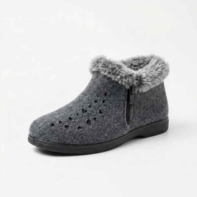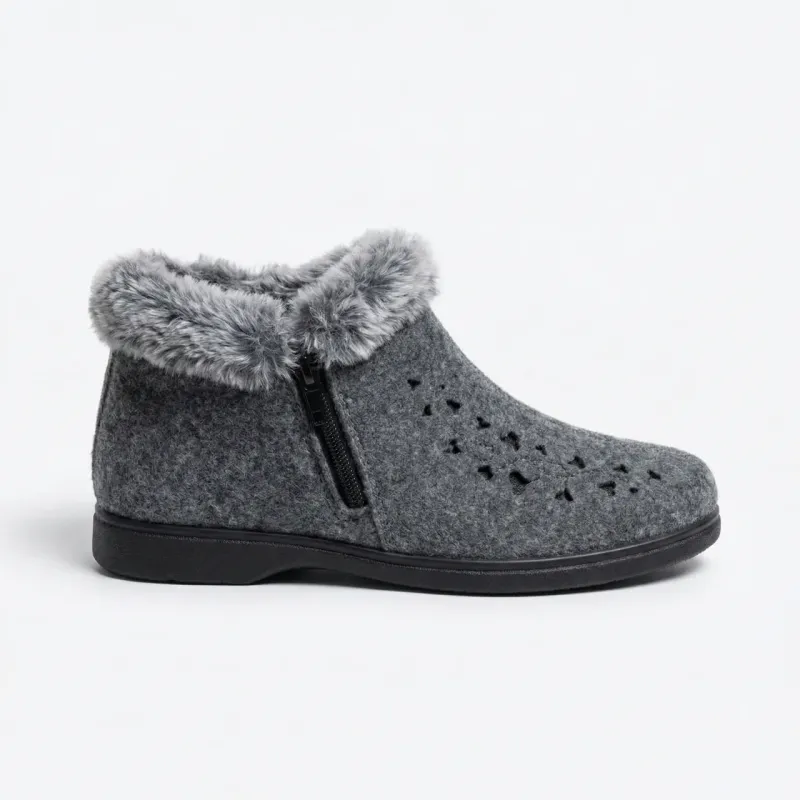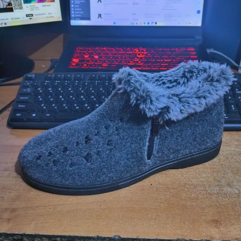 Дуже теплі та зручні жіночі бурки (черевики) сірого кольору — ідеальний варіант взуття для холодної пори року. Модель виготовлена з щільного повстяного матеріалу (сукно), який відмінно зберігає тепло, та прикрашена акуратним візерунком з перфорацією. Верх оздоблений пухнастим хутром, що додає затишку. Головні переваги моделі: Зручна застібка: Блискавка (змійка) збоку дозволяє легко та швидко взуватися, що особливо важливо для людей похилого віку. Тепло: Всередині бурки повністю утеплені густим штучним хутром. Підошва: Практична лита підошва дозволяє носити їх не тільки як домашні капці, але й виходити на вулицю в суху погоду (у двір, магазин). Це найкращий подарунок для мами чи бабусі, який зігріє їхні ніжки взимку. Взуття м'яке, не тисне і забезпечує максимальний комфорт при ходьбі. Характеристики: Матеріал верху: Повсть / Сукно (Текстиль) Утеплювач: Штучне хутро Застібка: Блискавка Підошва: ПВХ (для дому та вулиці) Колір: Сірий Розміри: 36, 37, 38, 39, 40, 41 Сезон: Зима / Холодна осінь