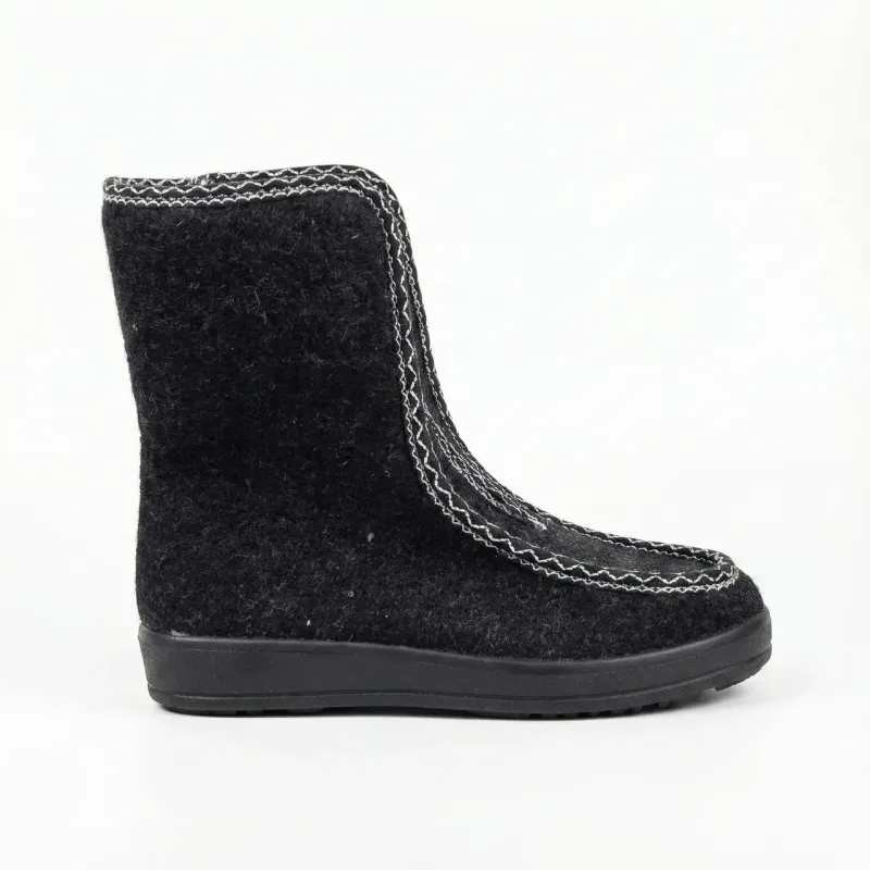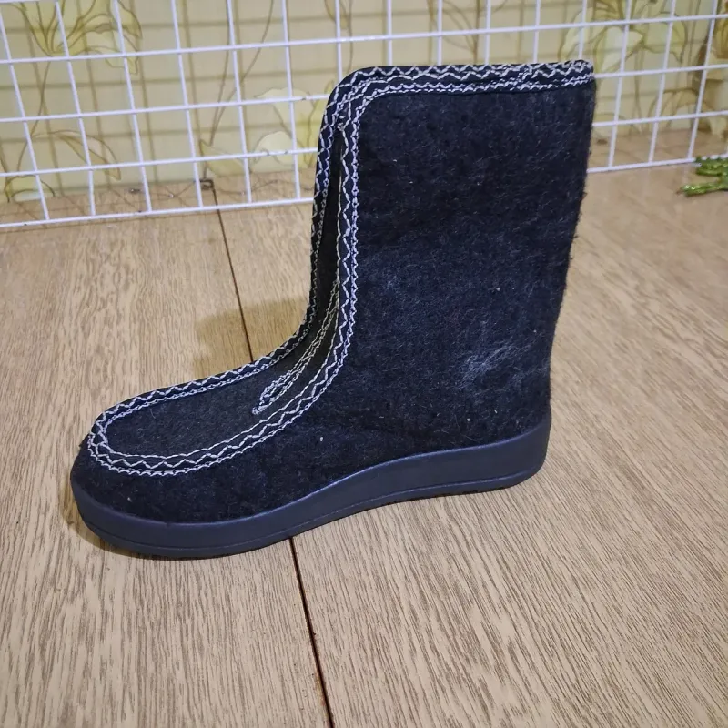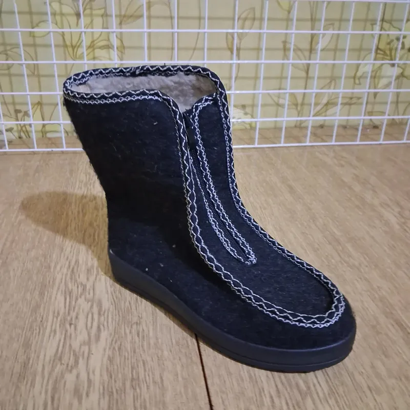 Класичні зимові бурки — це еталон тепла та домашнього затишку для ваших ніг. Ця модель ідеально підходить для літніх людей, а також для тих, хто працює в холодних приміщеннях або живе у приватному будинку. Верх виготовлений із щільного натурального сукна (повсті), яке дозволяє ногам "дихати", але при цьому надійно утримує тепло всередині. Черевики утеплені густим штучним хутром по всій внутрішній поверхні. Головна перевага моделі — зручна застібка-блискавка спереду ("змійка"), яка дозволяє легко взуватися людям з високим підйомом або набряклими ногами, не нахиляючись зайвий раз. Акуратна декоративна прострочка білою ниткою додає взуттю охайного вигляду. Лита підошва з ПВХ досить висока, щоб захистити від холодної підлоги, і має рифлений протектор для стійкості. Це взуття легке, м'яке і не сковує рухів. Характеристики: Сезон: Зима Матеріал верху: Сукно (Повсть) Матеріал підкладки: Штучне хутро Застібка: Блискавка спереду Підошва: ПВХ (протиковзка) Колір: Чорний (з білою строчкою) Розміри: 36-42