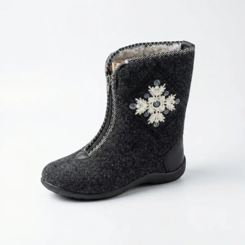 Затишні та дуже теплі жіночі бурки — це найкращий вибір для тих, хто цінує комфорт у холодну пору року. Ця модель виготовлена у класичному стилі та прикрашена оригінальною вишивкою (сніжинка/квітка) збоку, що надає їм привабливого вигляду. Вони стануть чудовим подарунком для мами, бабусі або для особистого користування у приватному будинку. Верх взуття пошитий з натурального сукна (повсті), яке чудово утримує тепло і створює правильний мікроклімат для ніг. Усередині бурки утеплені м'яким та густим штучним хутром світлого кольору. Завдяки зручній застібці-блискавці, яка розташована по центру, взуття легко взувати навіть людям з високим підйомом або проблемними ногами. Підошва лита, виготовлена з морозостійкого ПВХ. Вона не ковзає, досить висока, щоб захистити від холоду землі, та надійно з'єднана з верхом. Це легке, м'яке та практичне взуття зігріє вас навіть у люті морози. Характеристики: Матеріал верху: Сукно (повсть) Утеплювач: Штучне хутро (густе) Підошва: ПВХ (протиковзка) Застібка: Блискавка спереду Декор: Вишивка (біла нитка) Розміри: 37-41 Колір: Темно-сірий Країна виробник: Україна