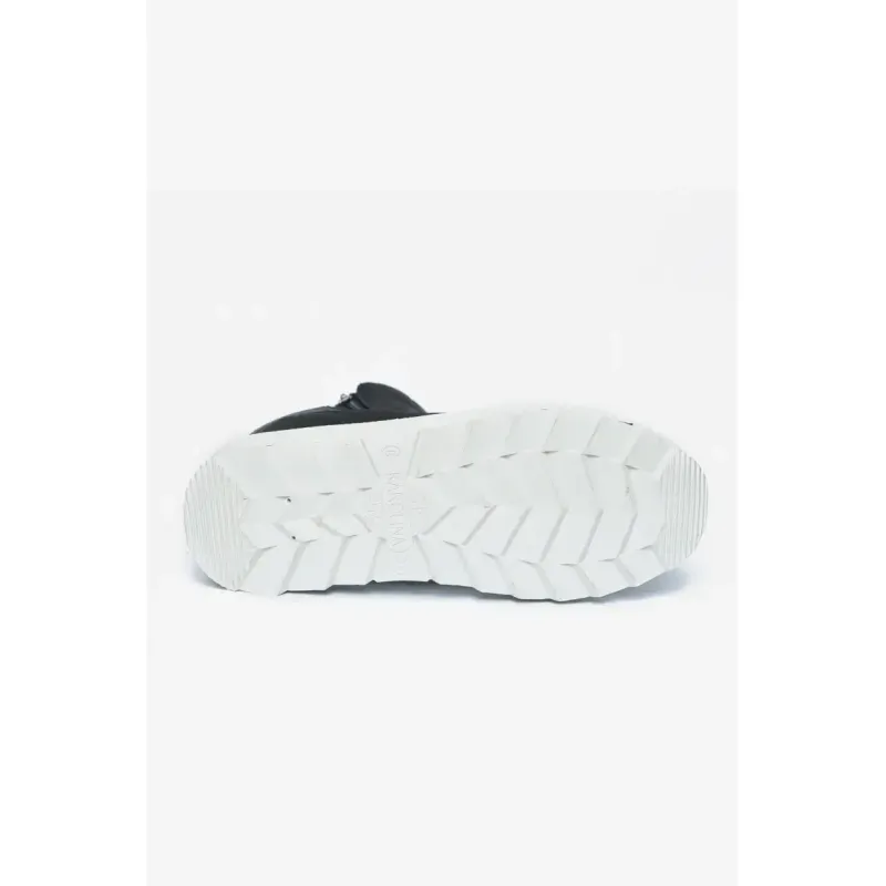 Ці чорні зимові дутики на білій підошві — ідеальний компроміс між теплом чобіт та зручністю улюблених кросівок. Модель створена для тих, хто не звик сидіти на місці навіть взимку. Верх виконаний з водовідштовхувального стьобаного текстилю, який надійно захищає від снігу та вологи. Головна фішка — масивна біла підошва, яка не лише стильно виглядає на контрасті, але й чудово амортизує та ізолює від холоду. Збоку розташована зручна блискавка, що дозволяє взуватися за секунду. Акуратний білий логотип додає моделі завершеного спортивного вигляду. Всередині — тепле хутро для максимального комфорту. Характеристики: Тип: Черевики / Дутики / Зимові снікерси. Сезон: Зима. Колір: Чорний з білою підошвою (Black/White). Матеріал верху: Плащівка / Текстиль. Застібка: Бічна блискавка. Особливості: Спортивний дизайн, контрастна підошва.