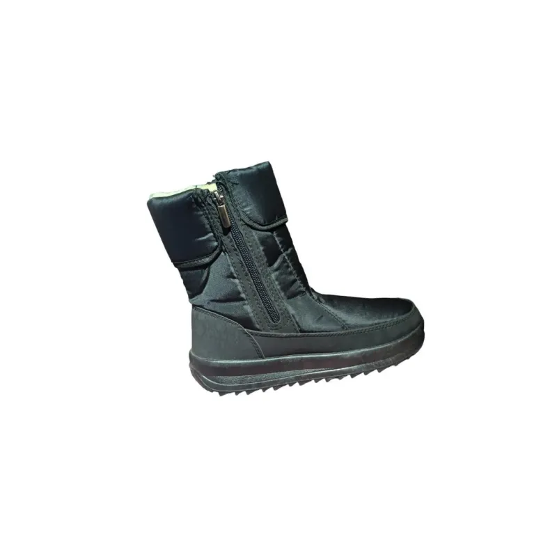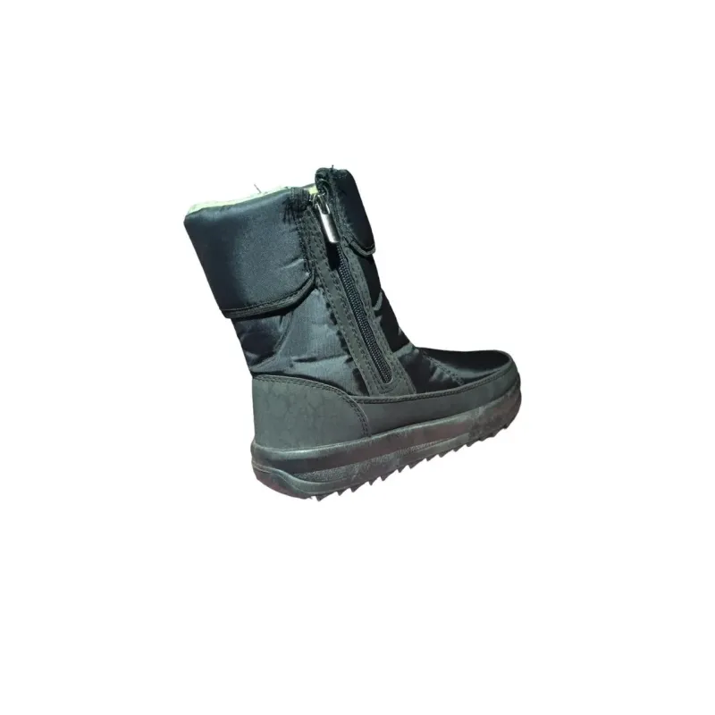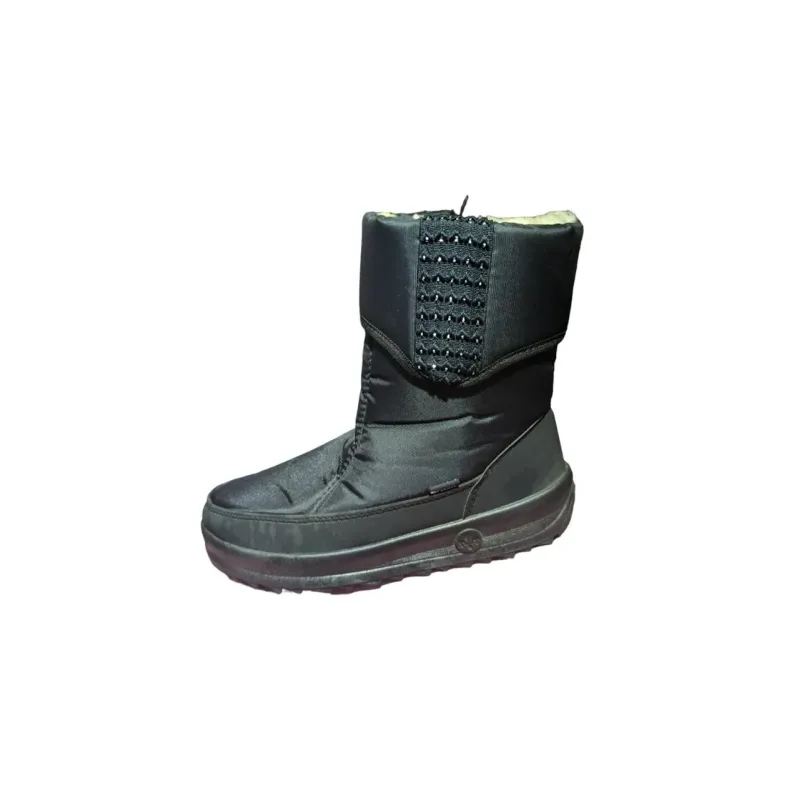 Ці високі чорні дутики доводять, що зимове взуття може бути не лише теплим, а й вишуканим. Модель ідеально підійде під шубу, пуховик або пальто, додаючи образу нотку гламуру. Верх виготовлений з якісного водовідштовхувального текстилю, який не боїться мокрого снігу. Головна прикраса моделі — широкий відворот, декорований вставкою з чорними сяючими елементами (стразами), що мерехтять на світлі. Висока підошва захищає від холоду, а анатомічна форма забезпечує комфорт протягом усього дня. Всередині — щільне хутро, яке огортає ноги теплом. Характеристики: Тип: Високі дутики / Чоботи. Сезон: Зима. Колір: Чорний (Black). Декор: Вставка зі стразами/камінням. Матеріал верху: Плащівка + Еко-шкіра (окантовка). Підошва: Потовщена, нековзна.