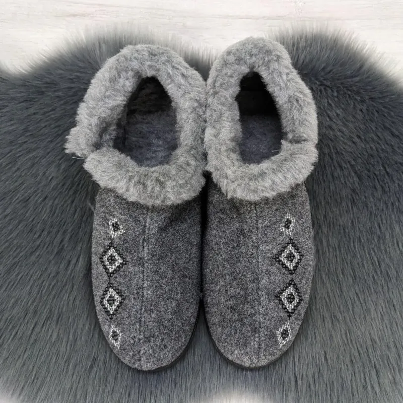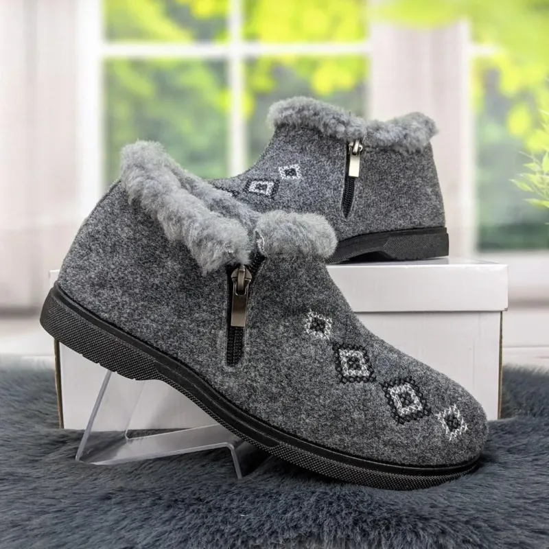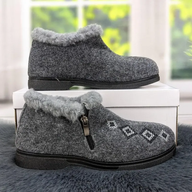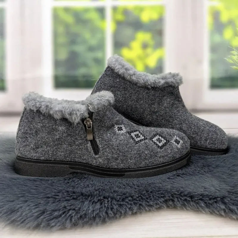 Подаруйте своїм ніжкам тепло та затишок з нашими зимовими жіночими чунями! Це ідеальне рішення для холодних квартир та приватних будинків. Модель виконана у вигляді акуратних напівчеревиків сірого кольору, прикрашених стильною геометричною вишивкою. Верх виготовлено з щільного нетканого матеріалу (текстиль під повсть), який чудово зберігає тепло. Всередині чуні повністю утеплені густим штучним хутром, яке створює ефект "сухого тепла" і не дає ногам мерзнути навіть у сильні морози. Головна перевага цієї моделі — наявність зручної блискавки збоку, що дозволяє легко взувати та знімати їх людям будь-якого віку, навіть із високим підйомом стопи. Підошва лита, виготовлена з міцного ПВХ. Вона не ковзає, досить гнучка і дозволяє використовувати це взуття не тільки в приміщенні, але й виходити на вулицю (наприклад, у двір приватного будинку). Це чудовий варіант подарунка для близьких, про яких ви хочете подбати. Характеристики: Матеріал верху: Щільний текстиль (сукно/фетр) Матеріал підкладки: Штучне хутро Підошва: ПВХ (для дому та вулиці) Застібка: Блискавка Колір: Темно-сірий з вишивкою Розміри: 37, 38, 39, 40, 41 Країна виробник: Україна Сезон: Зима / Холодна осінь