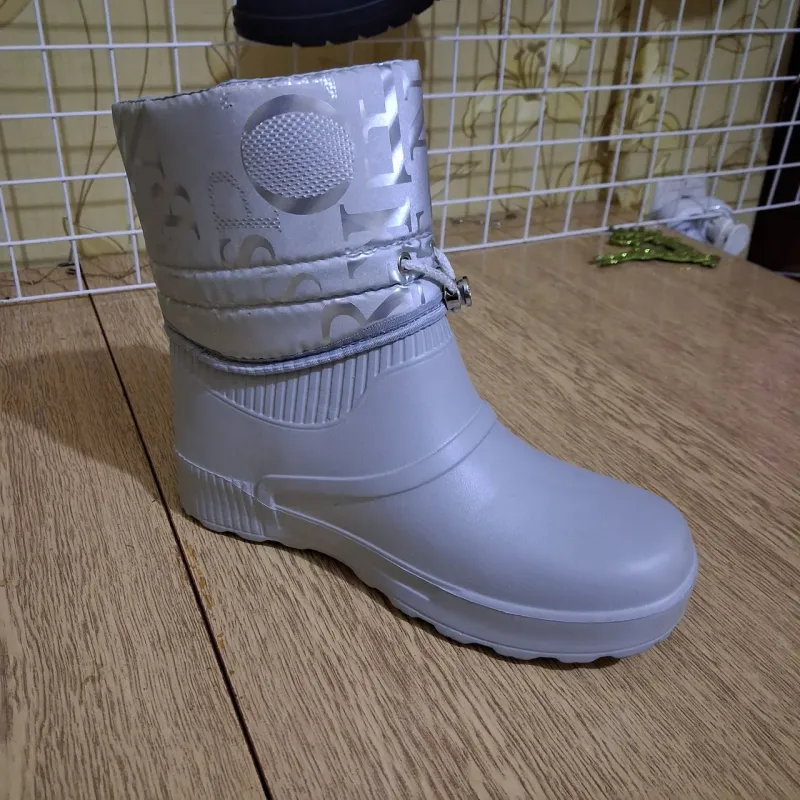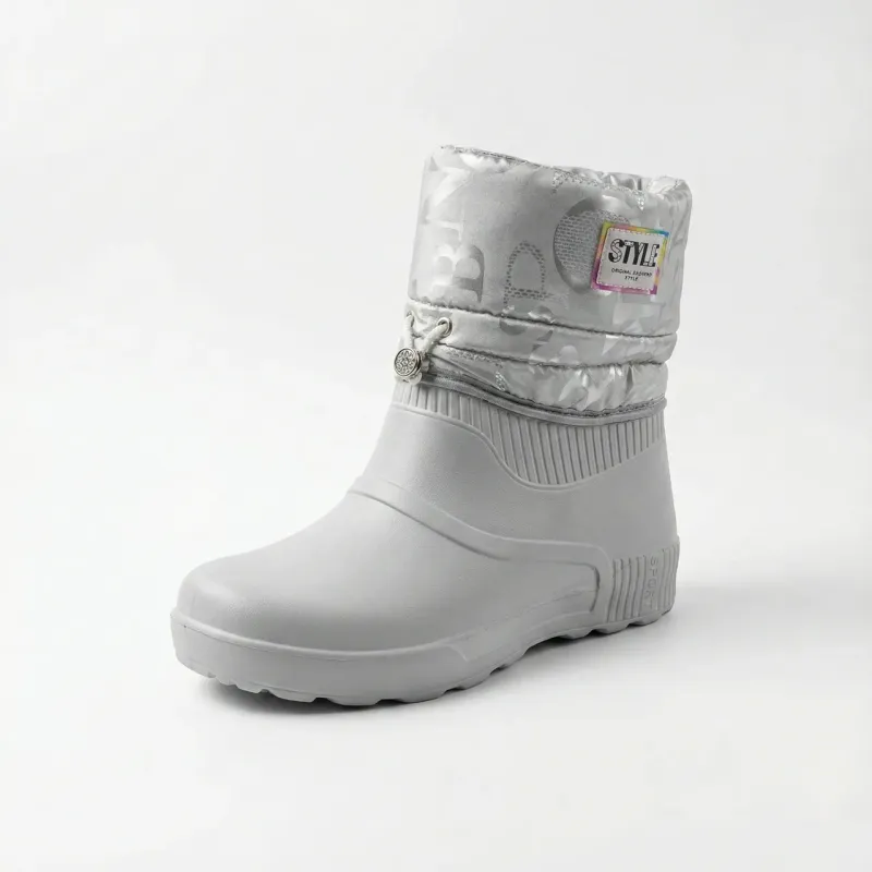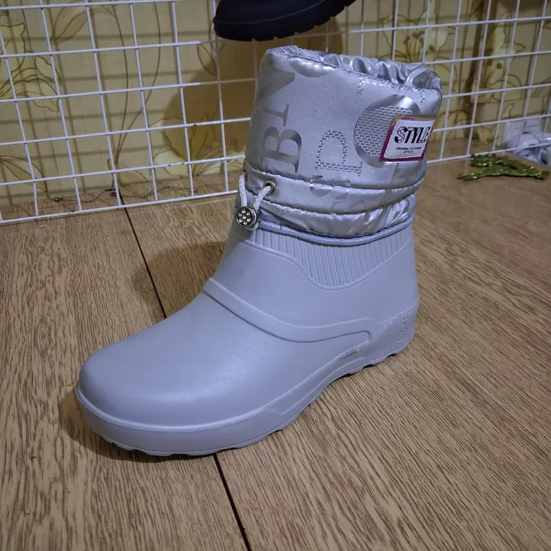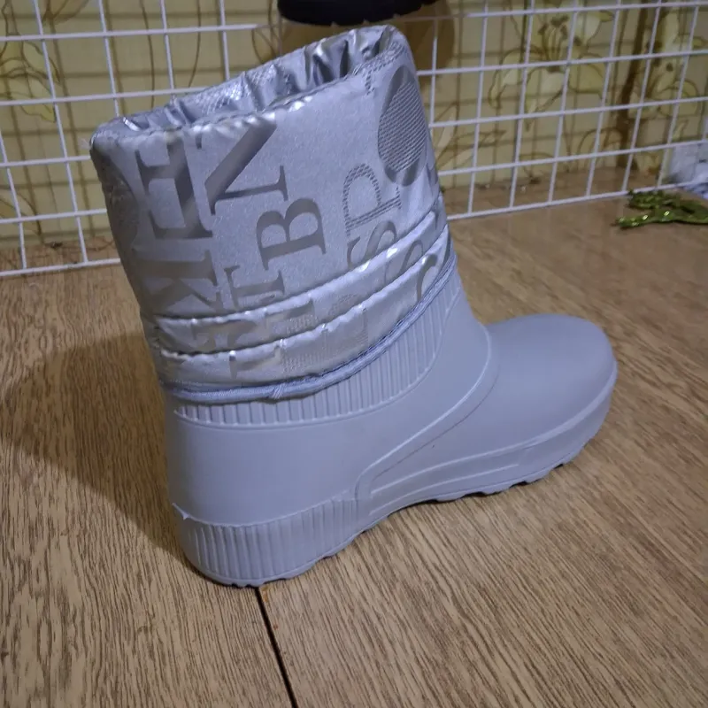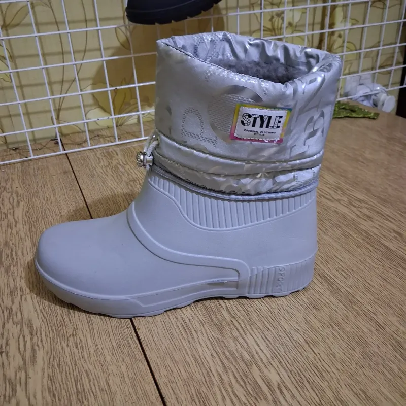 Ці стильні та неймовірно легкі жіночі дутики — ідеальне рішення для міської зими, коли сніг змінюється сльотою. Модель поєднує в собі практичність гумових чобіт та комфорт м'якого зимового взуття. Нижня частина виготовлена цільним литтям із піни ЕВА, що гарантує 100% захист від промокання, бруду та реагентів. Верх виконаний з якісної плащової тканини стильного сріблястого кольору з модним принтом-написом. Всередині чоботи утеплені густим та теплим штучним хутром (сірого кольору), яке забезпечує затишок навіть у морозну погоду. Модель декорована акуратною емблемою "Style" та декоративним шнурком з підвіскою-камінцем, що додає взуттю вишуканості. Чоботи легко взуваються (без застібок), мають зручну колодку та рифлену підошву, що не обтяжує ногу. Це чудовий вибір для прогулянок, походів у магазин або як змінне взуття. Характеристики: Сезон: Зима / Холодна осінь Матеріал низу: Піна ЕВА (водонепроникна) Матеріал верху: Водовідштовхувальний текстиль (плащівка) Матеріал підкладки: Густе штучне хутро Колір: Білий / Сріблястий (Металік) Розміри: 36-41 Особливості: Декоративна фурнітура, дуже легкі