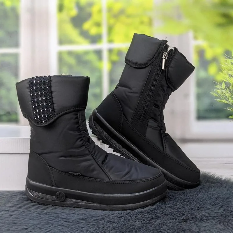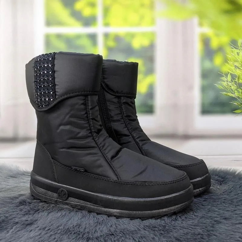 Ці чорні зимові дутики — ваш надійний захист від морозів та сльоти. Модель поєднує в собі практичність та елегантний дизайн, що дозволяє виглядати стильно навіть у найхолоднішу погоду. Верх виготовлений з міцного водовідштовхувального текстилю (плащівка), який легко чиститься і не пропускає вологу. Висока та товста підошва слугує надійним бар'єром від холодної землі, а рифлений протектор забезпечує стійкість на слизьких поверхнях. Родзинка моделі — стильний відворот, прикрашений декоративною вставкою з блискучими елементами, що додає образу вишуканості. Зручна бічна блискавка дозволяє швидко взуватися, не витрачаючи час на шнурівку. Характеристики: Тип: Чоботи / Дутики. Сезон: Зима. Колір: Чорний (Black). Матеріал верху: Водовідштовхувальний текстиль / Плащівка. Застібка: Блискавка (змійка). Особливості: Декоративний відворот, товста підошва.