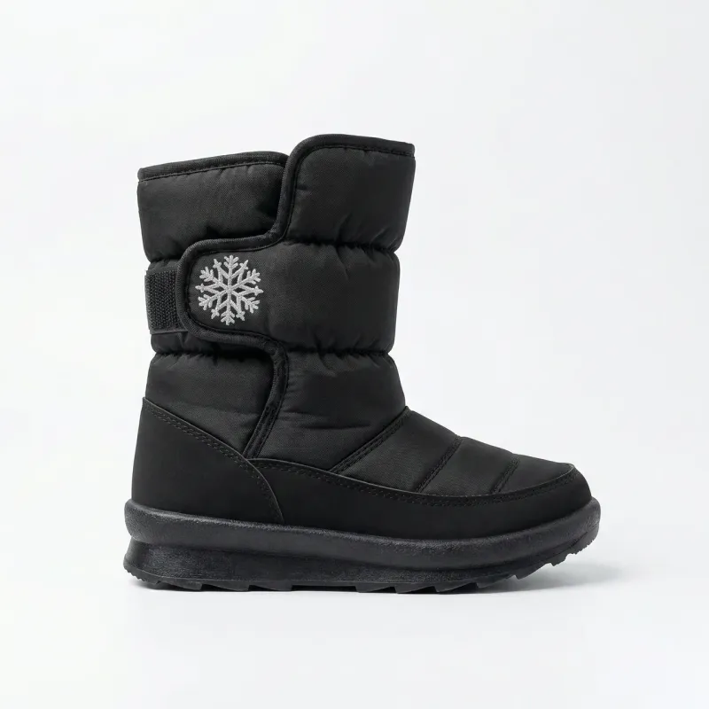Унікальна конструкція дутиків забезпечує максимальне утеплення завдяки спеціальному наповнювачу, який зберігає тепло навіть у найсуворіші морози. Чорний колір робить це взуття універсальним — воно чудово поєднується з будь-яким зимовим гардеробом, від спортивних курток до елегантних пальто. Декоративна сніжинка додає жіночності та вишуканості, перетворюючи практичне взуття на стильний аксесуар.