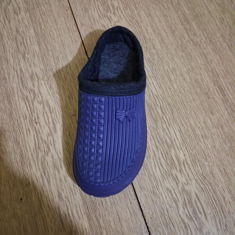 Яскраві та практичні жіночі сабо, які стануть незамінним взуттям для приватного будинку, дачі або роботи в прохолодних приміщеннях. Модель виконана в красивому фіолетовому кольорі та прикрашена акуратним литим бантиком, що додає взуттю жіночності. Основа виготовлена з легкого та водонепроникного матеріалу ЕВА (піна), який надійно захищає ноги від вологи, бруду та сльотавої погоди. Матеріал залишається еластичним навіть при мінусових температурах. Всередині галоші мають теплий вшитий утеплювач темного кольору (штучна повсть/хутро), який відмінно зберігає тепло і, на відміну від світлого хутра, є дуже практичним та немарким у використанні. Це взуття легко взувається завдяки відкритій п'яті та закритому носку. Підошва має рельєфний малюнок для стійкості на слизьких поверхнях. Галоші дуже прості у догляді — достатньо промити їх водою. Характеристики: Сезон: Зима / Осінь / Весна Матеріал верху: Піна ЕВА (водовідштовхувальна) Утеплювач: Штучна повсть/хутро (темний, немаркий) Колір: Фіолетовий (Синій) Декор: Бантик Розміри: 36-41 Призначення: Дім, сад, город, робота