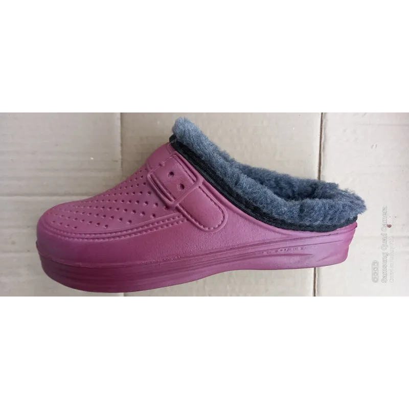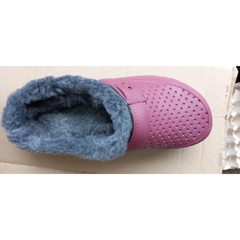 Шукаєте взуття, яке можна взути за секунду і вибігти на вулицю, не боячись холоду? Ці утеплені калоші-сабо — ідеальне рішення! Вони незамінні для мешканців приватних будинків, для роботи в саду в холодну пору року або просто як теплі домашні капці. Переваги моделі: Теплоізоляція: Всередині калоші повністю обшиті густим, м'яким еко-хутром, яке чудово зберігає тепло ніг. Зручність: Відсутність задника дозволяє взувати та знімати їх миттєво, без допомоги рук. Матеріал: Виготовлені з легкої піни (EVA), яка не пропускає вологу та бруд. Їх дуже легко мити — достатньо протерти ганчіркою. Дизайн: Перфорація зверху (імітація) та декоративний ремінець надають їм охайного вигляду. Характеристики: Розміри: 37, 38, 39, 40, 41 Колір: Бордовий (Марсала) Матеріал верху: Піна (EVA) Утеплювач: Штучне хутро (незнімне) Сезон: Осінь / Зима / Весна