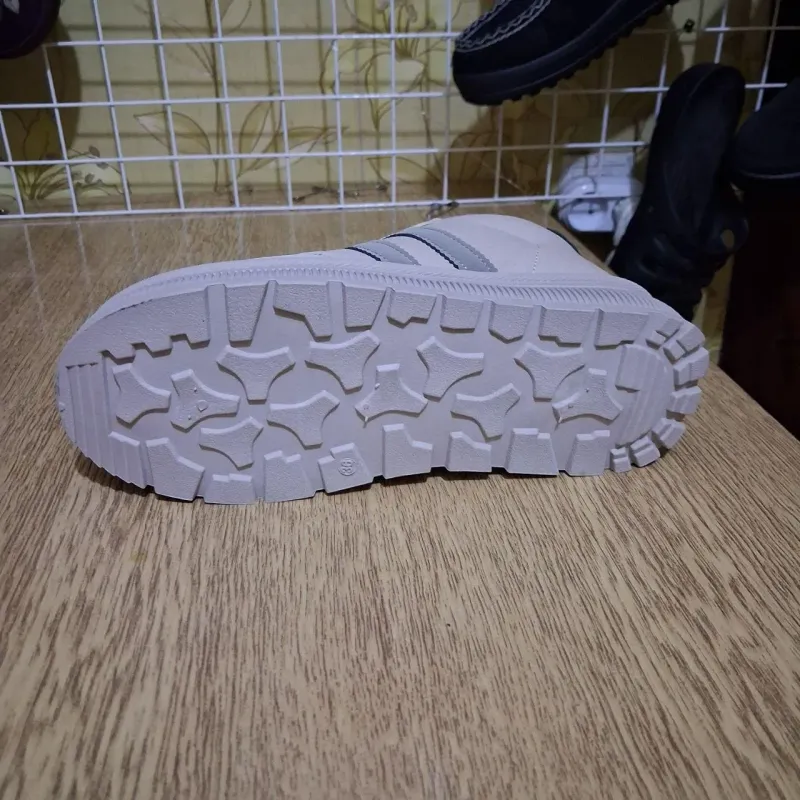 Цієї зими будьте у тренді з нашими стильними жіночими кросівками у ніжному бежевому кольорі. Модель поєднує в собі комфорт спортивного взуття та тепло зимових чобіт. Верх виготовлений з якісної еко-замші (нубуку), що виглядає дорого та сучасно. Світлий відтінок з сірими смужками освіжить ваш гардероб і пасуватиме до будь-якого пуховика чи парки. Головна "фішка" моделі — густе та м'яке хутро (під овчину), яке не лише зігріває, а й красиво виглядає на відвороті. Висока підошва-платформа надійно ізолює стопу від холодної землі та снігу, а також додає кілька сантиметрів до зросту. Широкі шнурки дозволяють зручно зафіксувати взуття на нозі. Характеристики: Тип взуття: Зимові кросівки / Хайтопи Матеріал верху: Еко-замша / Нубук Утеплювач: Штучне хутро (густе, тип "тедді") Підошва: ПВХ (масивна, антиковзка) Колір: Бежевий (світлий крем) Сезон: Зима Розміри в наявності: 36-41
