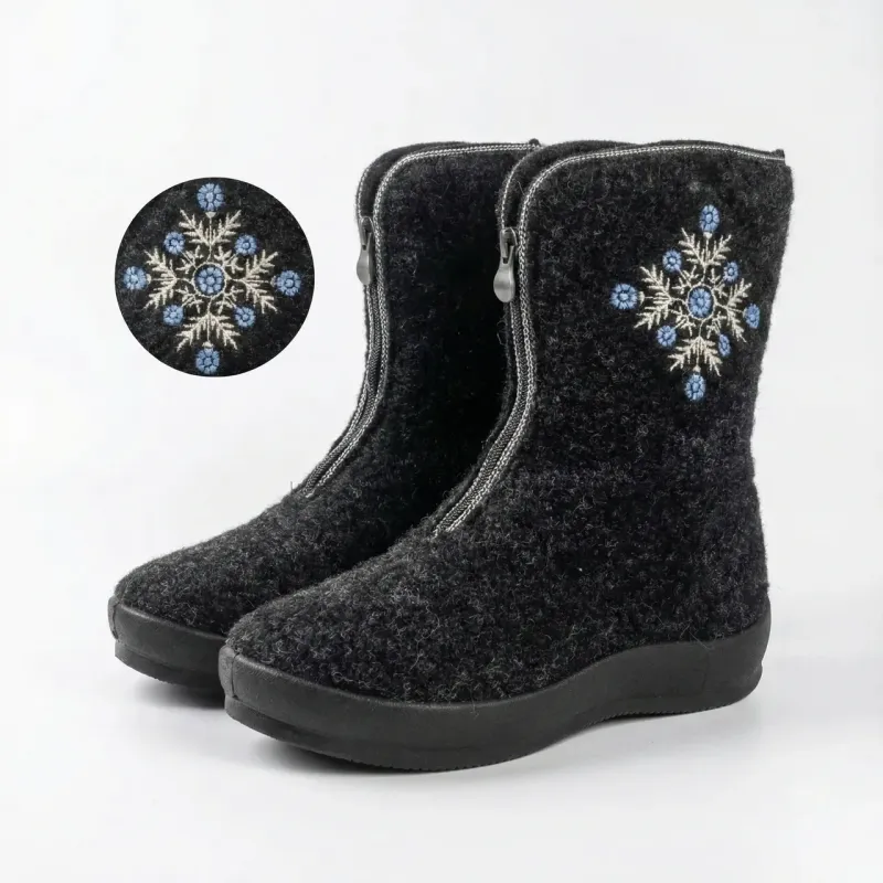 Чорні повстяні чобітки з вишивкою Сніжинка - ідеальний вибір для холодної пори року. Ці чобітки не тільки збережуть ваші ноги в теплі, але і додадуть вашому вигляду стиль і елегантність.