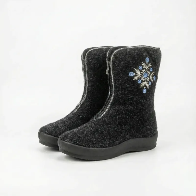 Чорні повстяні чобітки з вишивкою Сніжинка - ідеальний варіант для жінок, які хочуть бути стильними та теплими в зимовий період. Чобітки виготовлені з високоякісної повсті, що забезпечує добру теплоізоляцію та комфорт під час носіння.