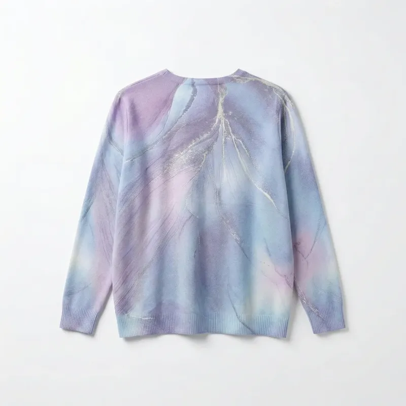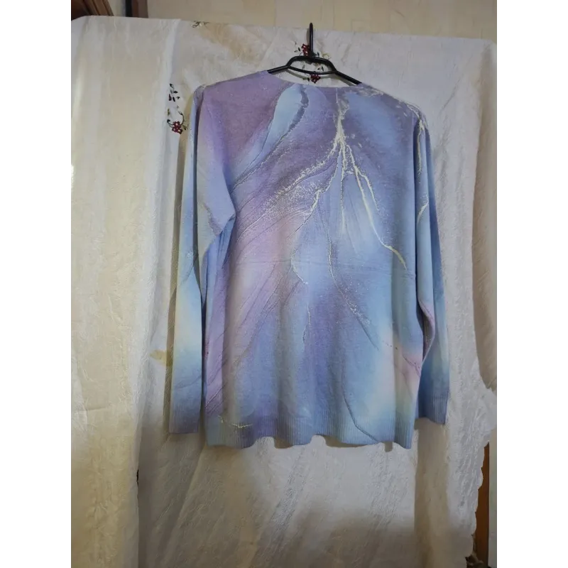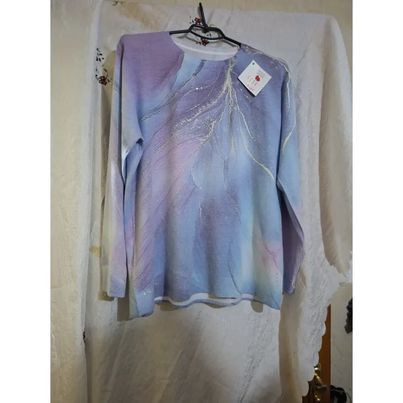 Додайте ніжності та елегантності у свій образ із новим жіночим светром від турецького бренду ELSA. Ця модель зачаровує своїм дизайном: абстрактний принт, що нагадує мармурові розводи або морозні візерунки у поєднанні м'яких блакитних та бузкових відтінків. Така палітра освіжає обличчя та візуально омолоджує. Особливого шарму виробу надає делікатне напилення сріблястим глітером (або дрібними стразами), що підкреслює лінії малюнка і створює ефект легкого мерехтіння. Светр виглядає ошатно, але не вичурно, тому чудово підійде як для святкових подій, так і для повсякденного носіння в офіс чи на прогулянку. Модель має комфортний вільний крій та м'яку, приємну на дотик фактуру трикотажу. Вона не сковує рухів і гарно сідає на фігуру розмірів 48, 50, 52. Малюнок нанесений як спереду, так і ззаду, що робить виріб гармонійним з усіх боків. Характеристики: Виробник: Туреччина (ТМ ELSA) Розмір: Універсальний (48-52) Матеріал: М'який трикотаж (машинна в'язка) Колір: Мультиколор (Блакитний / Бузковий / Білий) Декор: Сріблясте напилення / блиск Сезон: Весна / Осінь / Зима