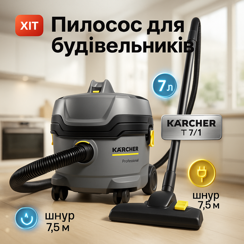 Професійний пилосос будівельний для сухого збирання Karcher T 7/1 Classic + 10 мішків можна замовити в інтернет-магазині Shtyrman. Перевіряйте модель, виробника, наявність і характеристики перед покупкою.