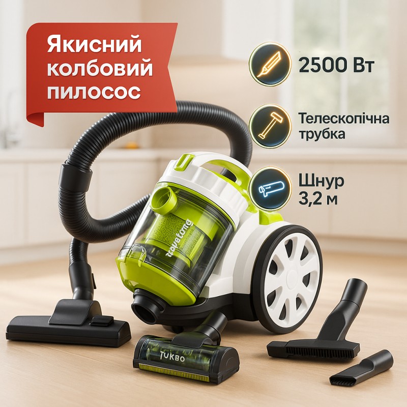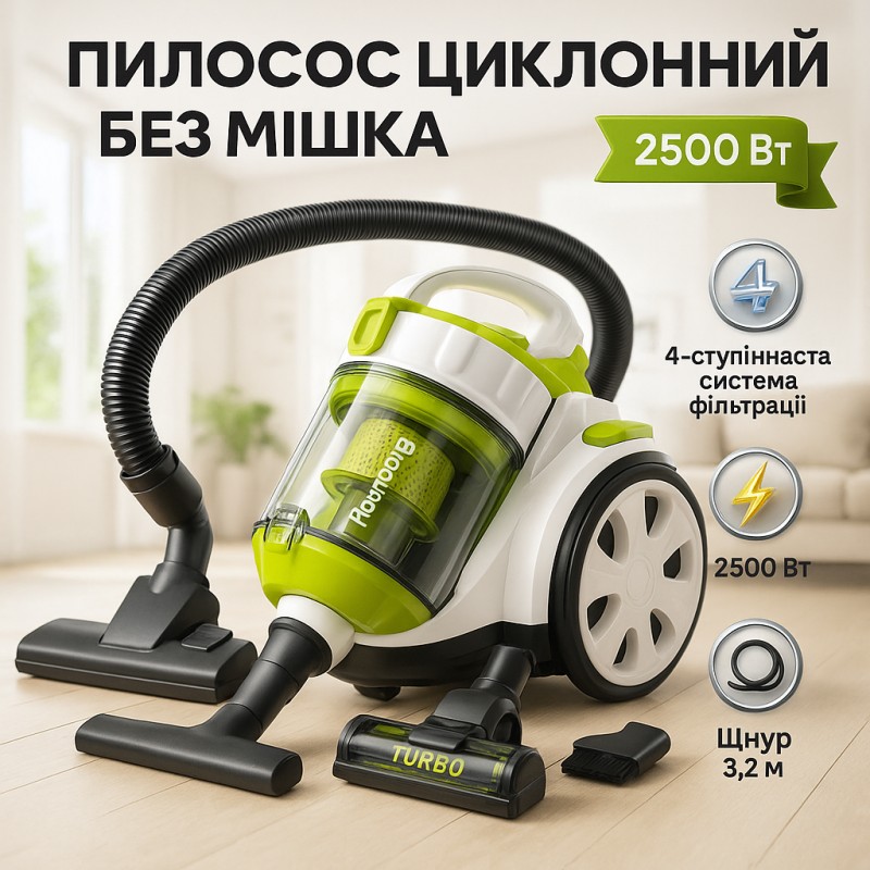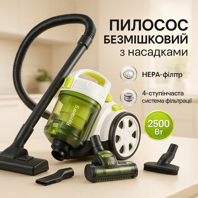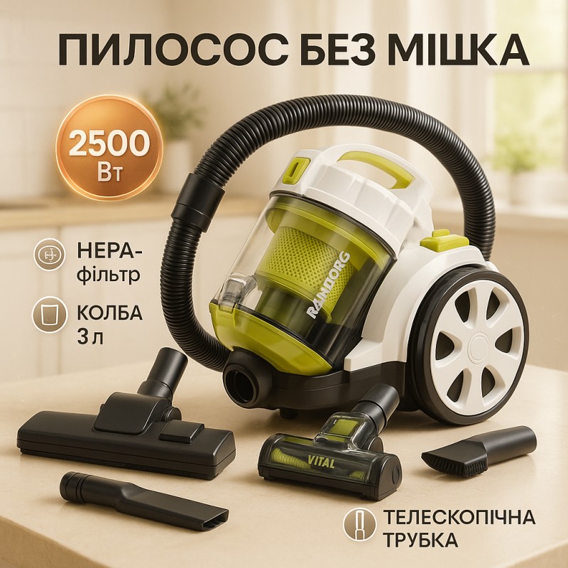 | Назва | Пылесос без мешка Rainberg RB-651 TB контейнерный 2500 Вт, шнур 3,2 метров с колбой объёмом 3 л |