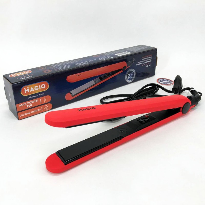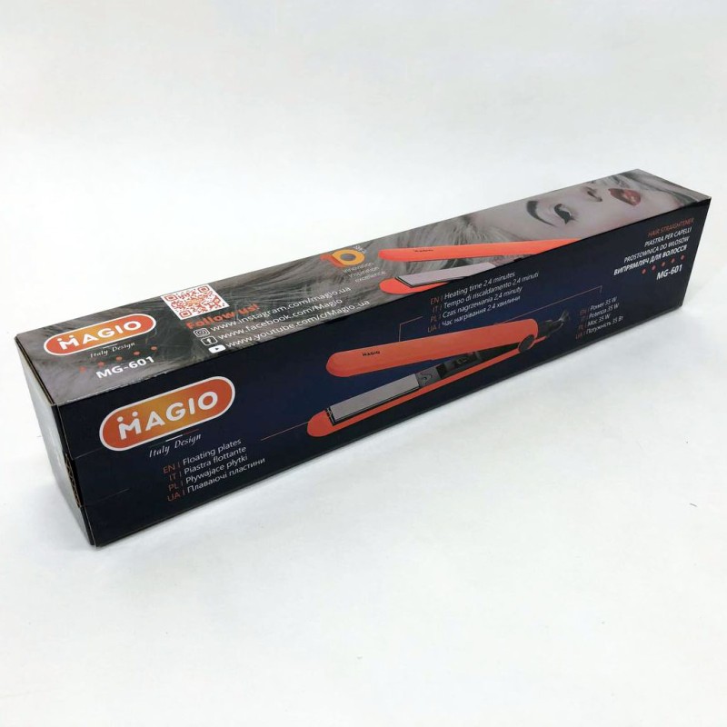 Випрямляч для волосся Magio MG-601 має стильний тонкий корпус. Абсолютна простота – ключова особливість моделі. Корпус виконаний з приємного на дотик високоякісного пластику, який запобігає плавленню при нагріванні та гарантує тривалий термін служби інструменту. Матеріал поверхні робочих пластин – двошарова кераміка, що впливає не тільки на кінцевий результат зачіски, але й на здоров'я волосся. Такий вид пластин завдає найменшої шкоди, швидко та рівномірно нагріваються, легко ковзають по волоссю та запобігають електризації. Випрямляч оснащений подовженими (90 мм) нагрівальними пластинами шириною 24 мм, які дозволяють досягти ідеальних результатів за короткий час. Випрямляч швидко нагрівається і буде готовий до використання менше ніж за хвилину. Петелька для підвішування і шнур, що обертається на 360° довжиною 1,8 м створюють додаткову зручність при використанні.