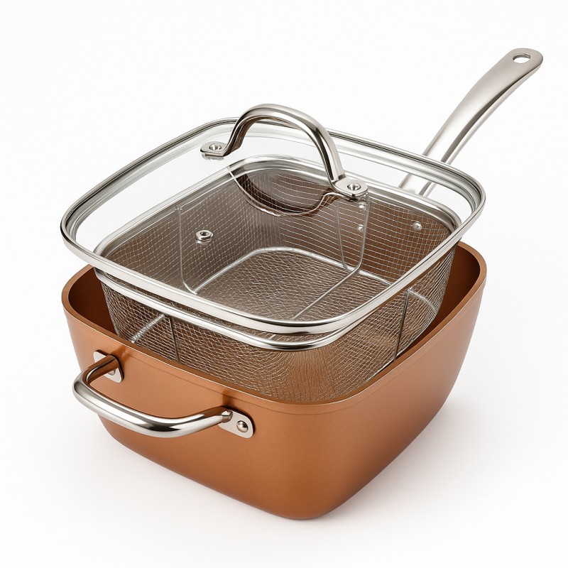 Сваренные в чудо-сковороде блюда обладают незабываемым вкусом, специальный медно-керамический сплав равномерно распределяет температуру и на дне сковороды и на высоких стенках что создаёт эффект равномерного теплового воздействия.