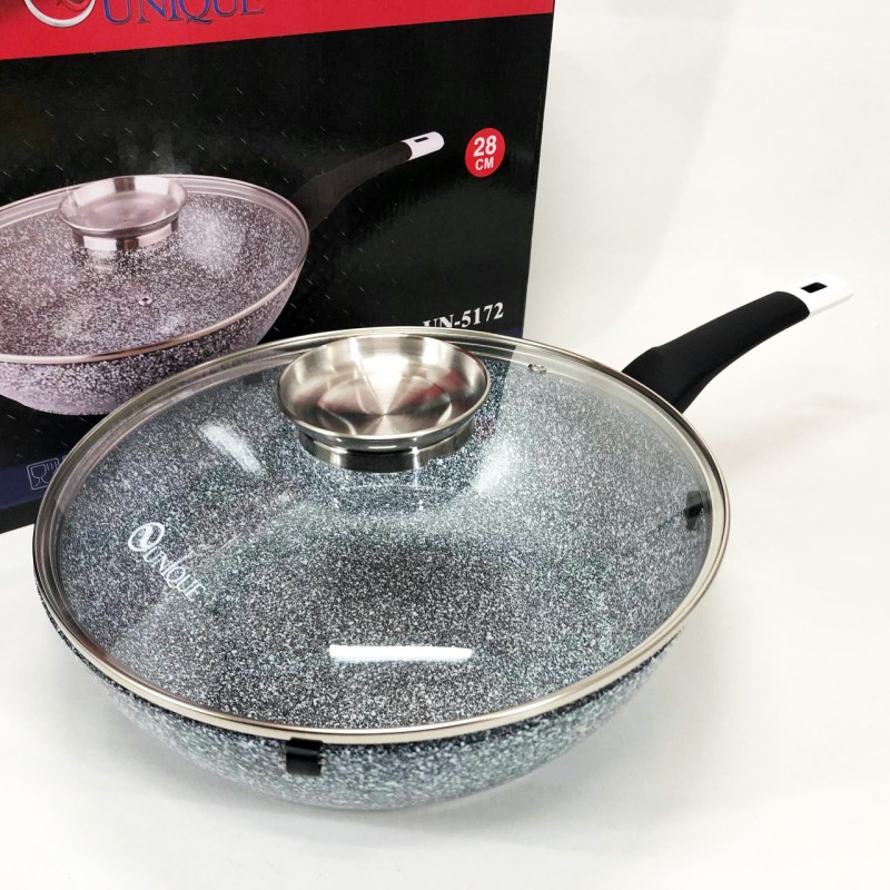 Сковорода UNIQUE виготовлена з литого алюмінію з багатошаровим гранітним антипригарним покриттям. Таке покриття не змінює смаку їжі і не вбирає запахи.