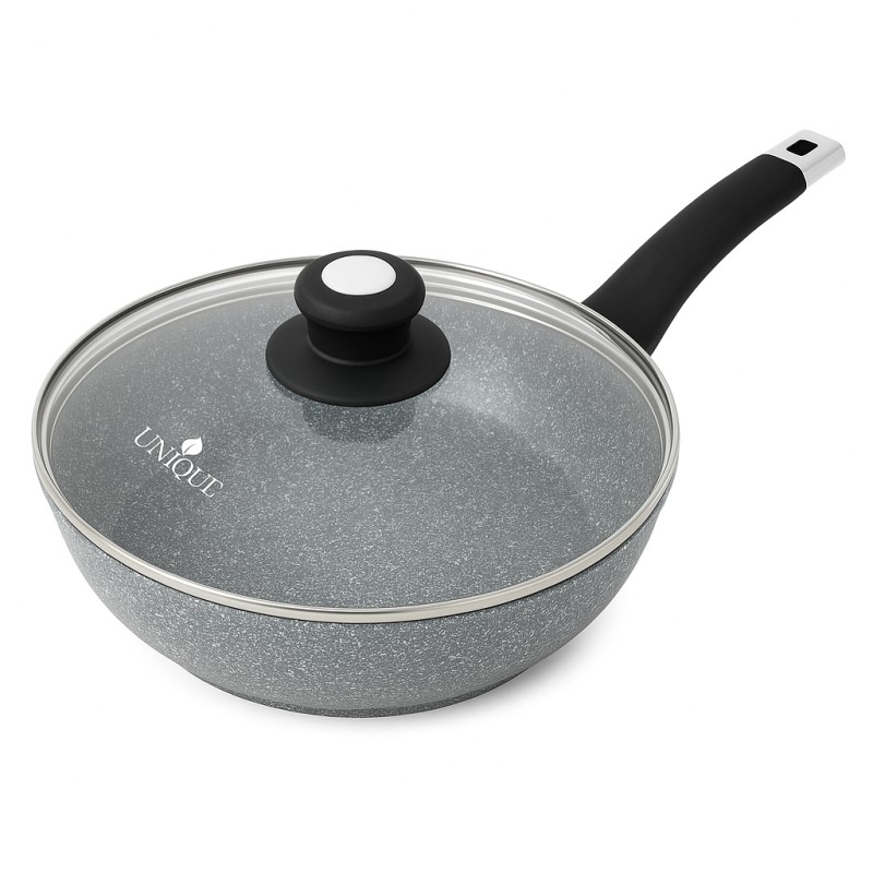 Сковорода UNIQUE UN-5115 имеет высококачественное гранитное антипригарное покрытие. Преимущество данного покрытия — это многослойное покрытие из нескольких слоев каменной крошки на минеральной основе. Частицы гранита значительно усиливают защиту антипригарного покрытия, благодаря чему сковорода износостойка и долговечна. Новая система пористого антипригарного покрытия позволяет прожаривать продукты до хрустящей корочки.