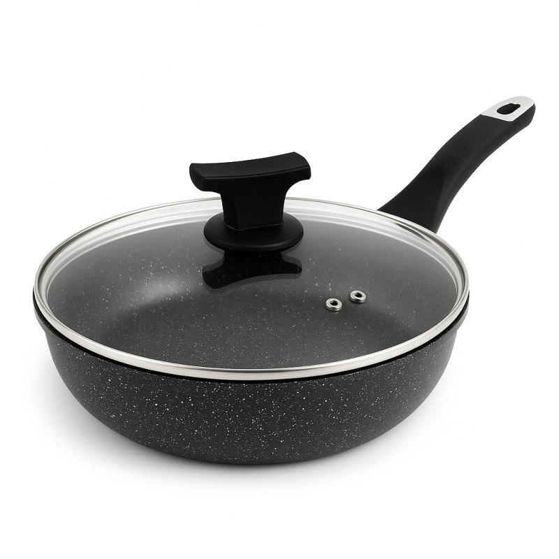 Сковорода с стеклянной крышкой UNIQUE Granite coating с антипригарными свойствами, она износостойка и долговечна. Новая система пористого антипригарного покрытия позволяет прожаривать продукты до хрустящей корочки. Стильная и удобная а так же долговечная сковорода UNIQUE с гранитным покрытием найдет свое место на любой кухне. Перед первым использованием вымойте посуду моющим средством, сполосните, просушите. Запрещается использовать металлические губки, а также средства содержащие абразивные добавки и хлор. Для мытья посуды можно использовать посудомоечную машину, так и ручную мойку. Резкий перепад температур может привести к порче покрытия, поэтому не ставьте на горячую конфорку посуду из холодильника. Готовить пищу следует при небольшом или среднем нагреве. Не оставляйте на горячей конфорке посуду на длительное время.