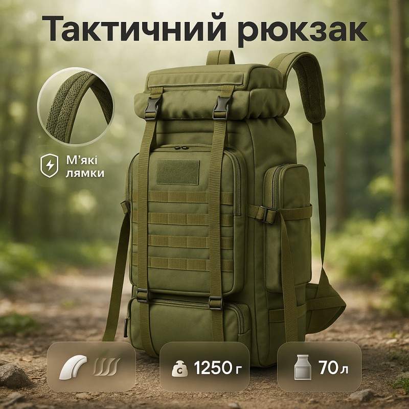 Тактичний рюкзак на 70л - ідеальний вибір для армії та походів. Цей рюкзак виготовлений з високоякісних матеріалів та має міцну конструкцію, що дозволяє йому витримувати великі вантажі та складні умови.