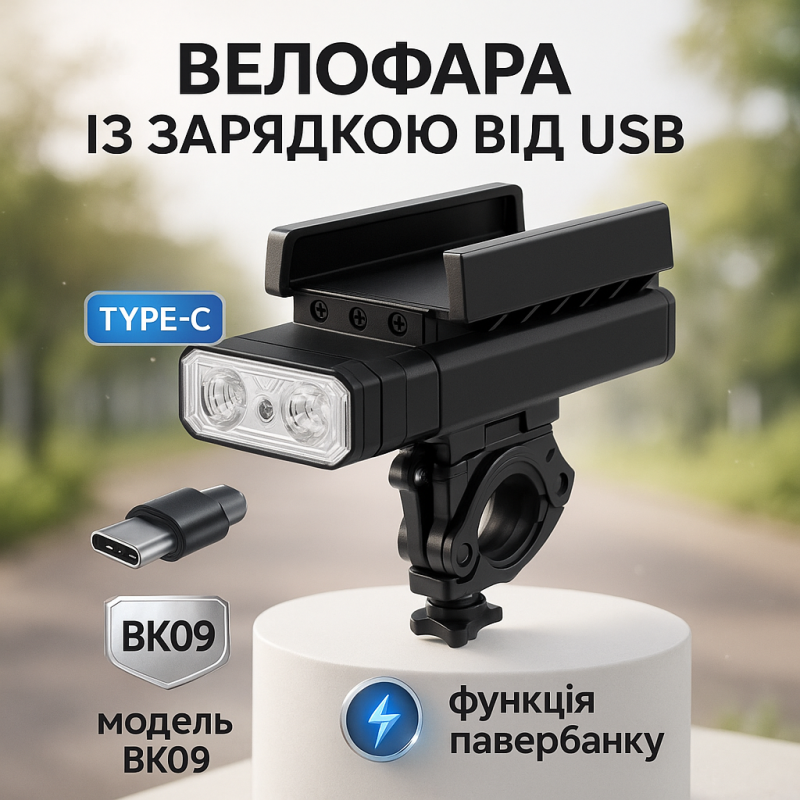 Велоліхтар BK09/Z-03-3T6— це універсальний велосипедний світлодіодний ліхтар із функцією Power Bank, який поєднує яскраве освітлення та можливість підзарядки мобільних пристроїв. Оснащений сучасним Li-Ion акумулятором та зручним зарядним портом Type-C, цей ліхтар забезпечує надійну роботу навіть під час тривалих поїздок. Завдяки кріпленню під телефон він стає багатофункціональним аксесуаром, що дозволяє одночасно освітлювати дорогу та використовувати смартфон для навігації чи прослуховування музики.