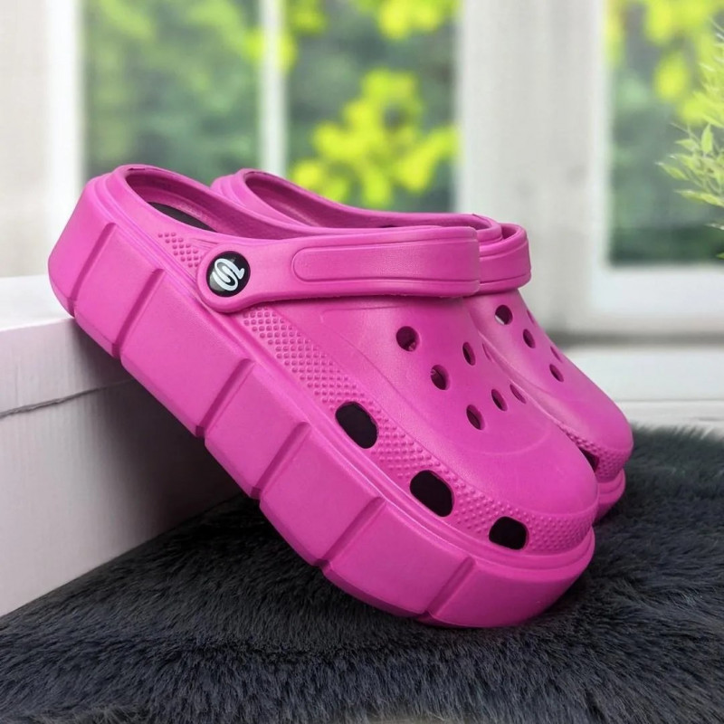 Теги: крокси, сабо, пляжне взуття, літнє взуття, жіноча мода, рожеві туфлі, високі платформи